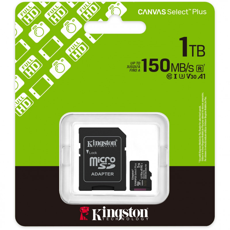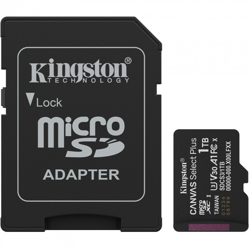 "Kingston Technology 1TB microSDXC Canvas Select Plus Gen3 150MB/s A1 Card + Adapter. Capacity: 1 TB, Flash card type: MicroSDXC, Flash memory class: Class 10, Internal memory type: UHS-I, Read speed: 150 MB/s, UHS Speed Class: Class 3 (U3), Video Speed Class: V30. Product colour: Black"\n"with Android A1 Performance Class