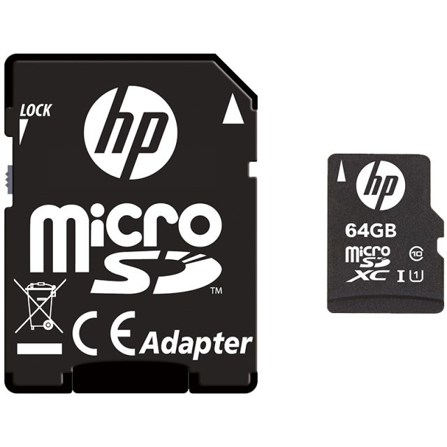 "HP SDU64GBXC10HP-EF. Capacity: 64 GB, Flash card type: MicroSDXC, Flash memory class: Class 10, Internal memory type: UHS-I, UHS Speed Class: Class 1 (U1). Product colour: Black"\n"HP high speed UHS-I U1 flash memory cards are ready to store your latest digital content for your smartphone, tablet and other mobile devices."