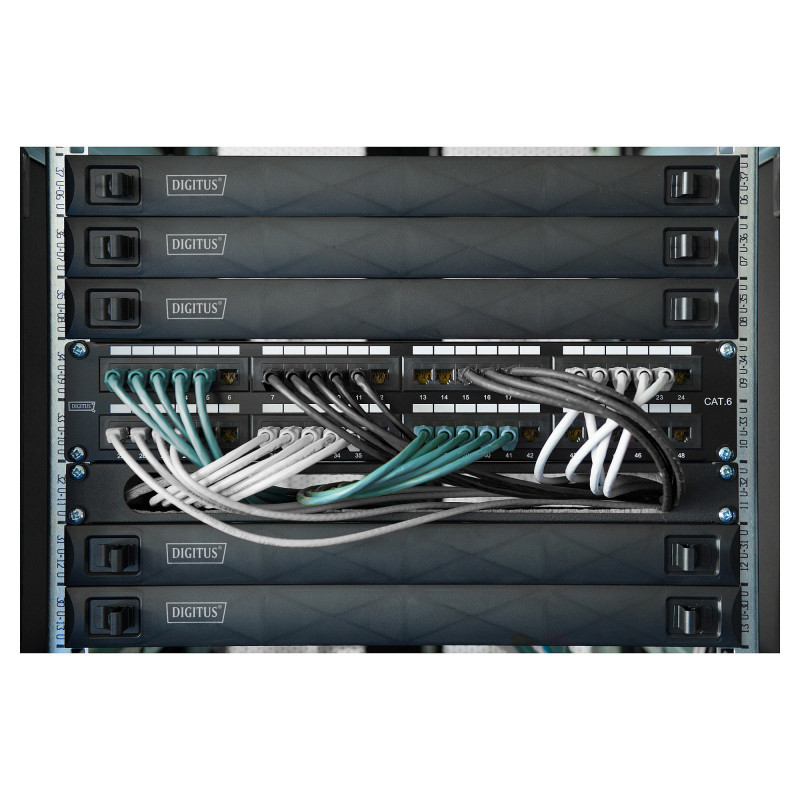 The shielded CAT 6A keystone module set DN-93617-48 from DIGITUS® impresses with future-oriented standards and high-end quality for your network. The modules have 360° shield contacting, a locking lever and a reclosable, intelligent cable manager for strain relief and cable fixing. The compact design allows for row installation in 483 mm (19"") 1U panels. The tool-free installation is carried out via LSA strips, color-coded in accordance with EIA/TIA 568 A&B. Thanks to its compact design, the module also fits into design-compatible modular junction boxes."