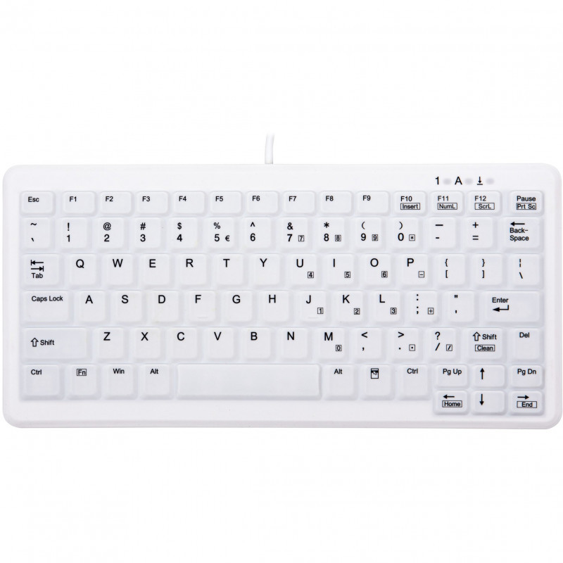 "CHERRY AK-C4110. Keyboard style: Straight. Connectivity technology: Wired, Device interface: USB, Keyboard layout: QWERTY, Recommended usage: Medical. Product colour: White"\n"The compact hygiene keyboard AK-C4110 is a high quality PC keyboard in a notebook design. The silicone membrane protects the keyfield against the ingress of dirt and fluids. Due to the small dimensions the AK-C4110 is especially made for the use with limited space."