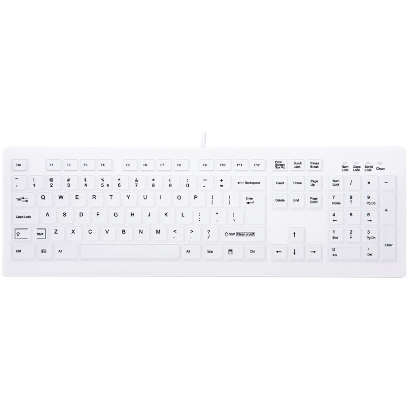 "Contour Design Active Key AK-C8100F-U1-W/US. Keyboard style: Straight. Connectivity technology: Wired, Device interface: USB, Keyboard key switch: Membrane, Keyboard layout: QWERTY, Keyboard number of keys: 105, Recommended usage: Medical. Product colour: White"\n"The AK-C8100 is a high quality PC keyboard in a standard layout. The silicone membrane protects the key field against the ingress of dirt and fluids.