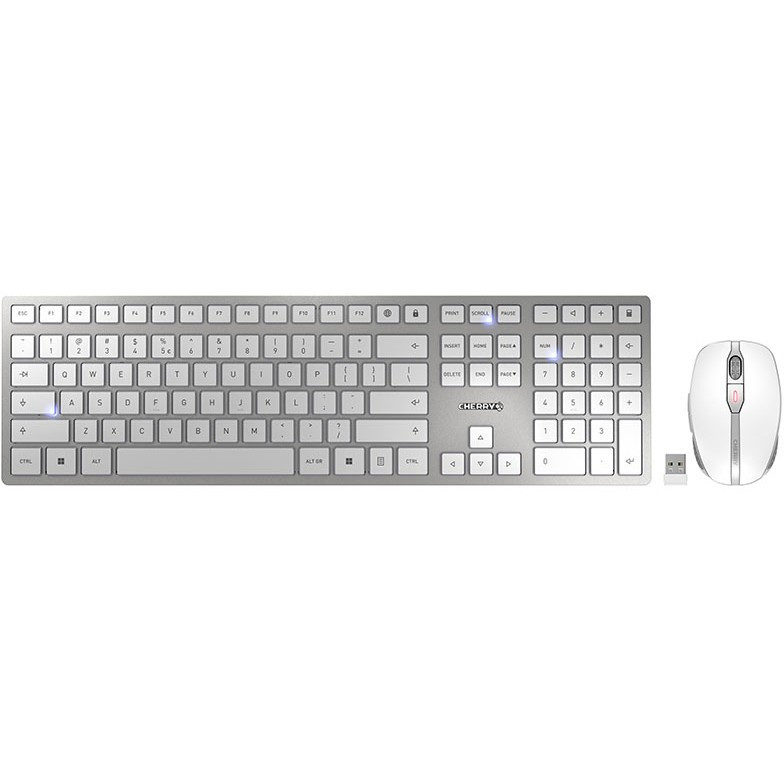 "CHERRY DW 9100 SLIM. Connectivity technology: Wireless, Device interface: RF Wireless + Bluetooth, Keyboard layout: AZERTY, Keyboard number of keys: 111, Recommended usage: Universal. Product colour: Black. Mouse included"\n"Rechargeable designer desktop with many extra features