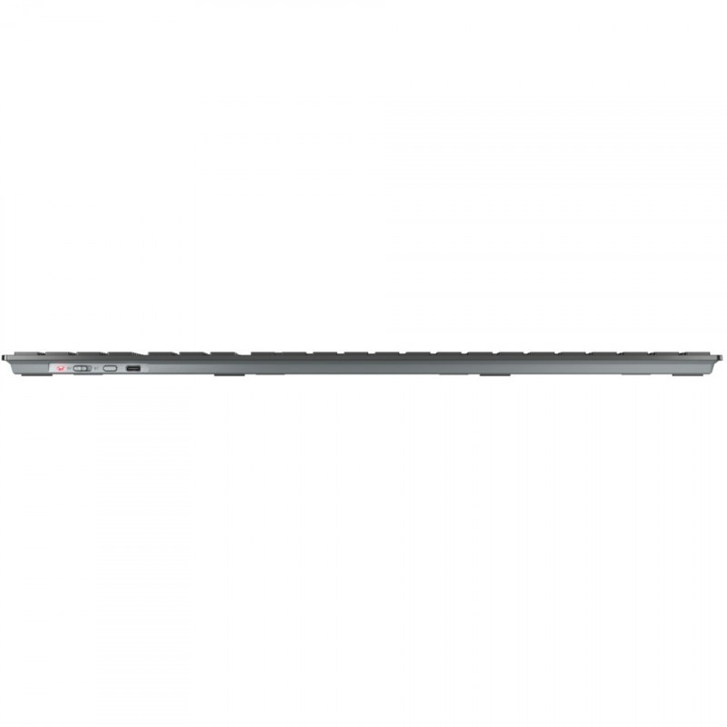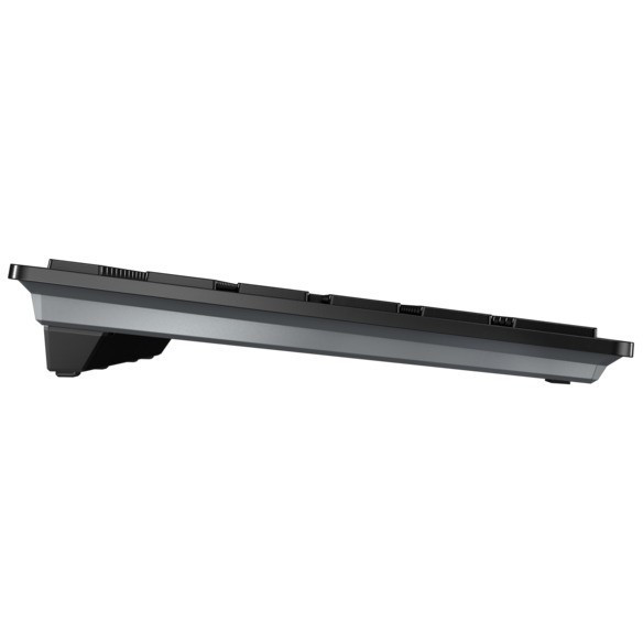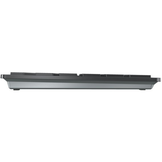"CHERRY KW 9100 SLIM. Keyboard style: Straight. Connectivity technology: Wireless, Device interface: RF Wireless + Bluetooth, Keyboard layout: QWERTY, Keyboard number of keys: 108. Cable length: 1.2 m. Recommended usage: Universal. Product colour: Black"\n"Quality meets design and innovation. The CHERRY KW 9100 SLIM is a silver-black version of the keyboard from the popular DW 9100 SLIM desktop set. As with the tried and tested desktop version, first-class workmanship, perfectly coordinated design and innovative functions come together.