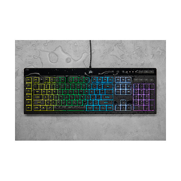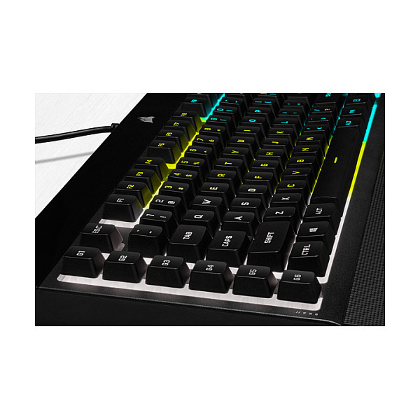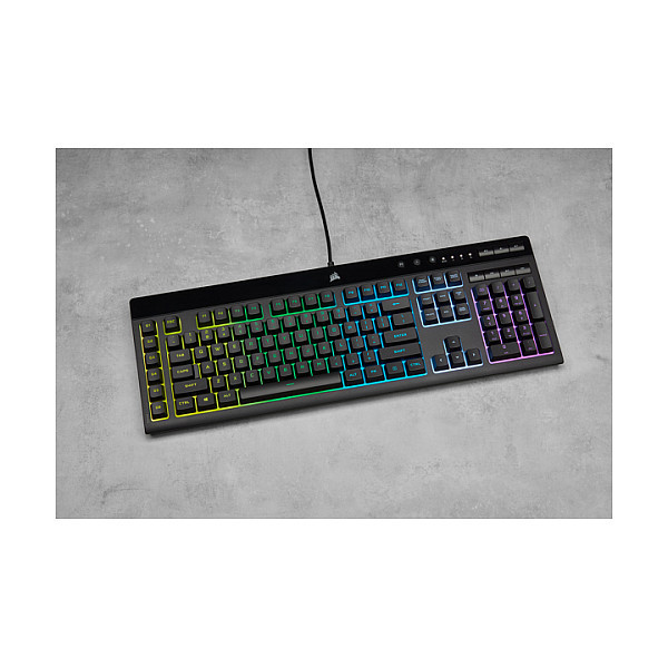 "Corsair K55 RGB PRO. Keyboard form factor: Full-size (100%). Keyboard style: Straight. Connectivity technology: Wired, Device interface: USB, Keyboard layout: AZERTY. Backlight type: RGB LED, Wrist rest. Recommended usage: Gaming. Product colour: Black"\n"The CORSAIR K55 RGB PRO Gaming Keyboard lights up your desktop with five-zone dynamic RGB backlighting and powers up your gameplay with six dedicated macro keys.