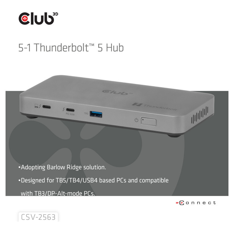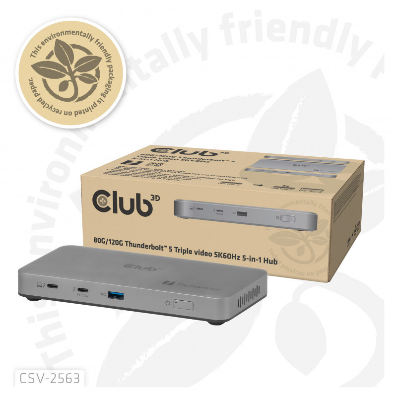 "CLUB3D CSV-2563 5-1 Thunderbolt™ 5 Hub Triple video 5K60Hz Thunderbolt™ Share Certifi ed 180W. Host interface: Thunderbolt 5, Hub interfaces: Thunderbolt 5, USB 3.2 Gen 2 (3.1 Gen 2) Type-A. Data transfer rate: 120000 Mbit/s, Maximum refresh rate: 60 Hz, Supported graphics resolutions: 5120 x 2880, 7680 x 4320. Power supply type: DC, Power supply: 180 W. Width: 170 mm, Depth: 85 mm, Height: 22 mm. Quantity per pack: 1 pc(s), Package width: 220 mm, Package depth: 150 mm"\n"The Club 3D CSV-2563 is a Certified Thunderbolt™ 5 portable Hub which provides the most advanced, efficient, and versatile I/O solution available with up to 80Gbps or 120Gbps for data and video."