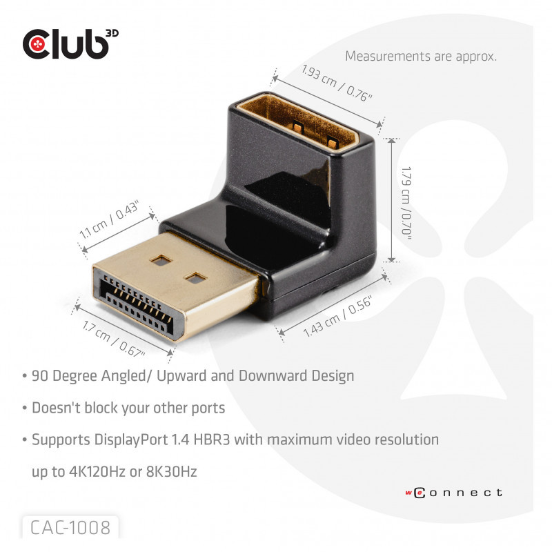 "CLUB3D DisplayPort Male to DisplayPort 1.4 Female 90 Degree Angled Adapter 4K120Hz M/F. Connector 1: DisplayPort, Connector 2: DisplayPort. Product colour: Black"\n"The Club 3D CAC-1008 DisplayPort™ Male to DisplayPort™ 1.4 Female 90 Degree Angled Adapter 4K120Hz M/F is a versatile angle connector adapters providing cable management solutions. With this adapter you can avoid blocking other ports on your host device. Also for displays with a tight location on the DisplayPort™ input this can be an easy fix for not blocking other ports and/or bending cables. This set contains 1 of adapter and is universal in their usage for supporting display resolutions of up to 4096*2160 at 120Hz or 7680*4320 at 30Hz . The adapters are verified with Club 3D products to support these resolutions. Its important that the source and display should support DP™1.4 and the cables are also designed to support this bandwidth.