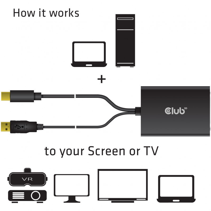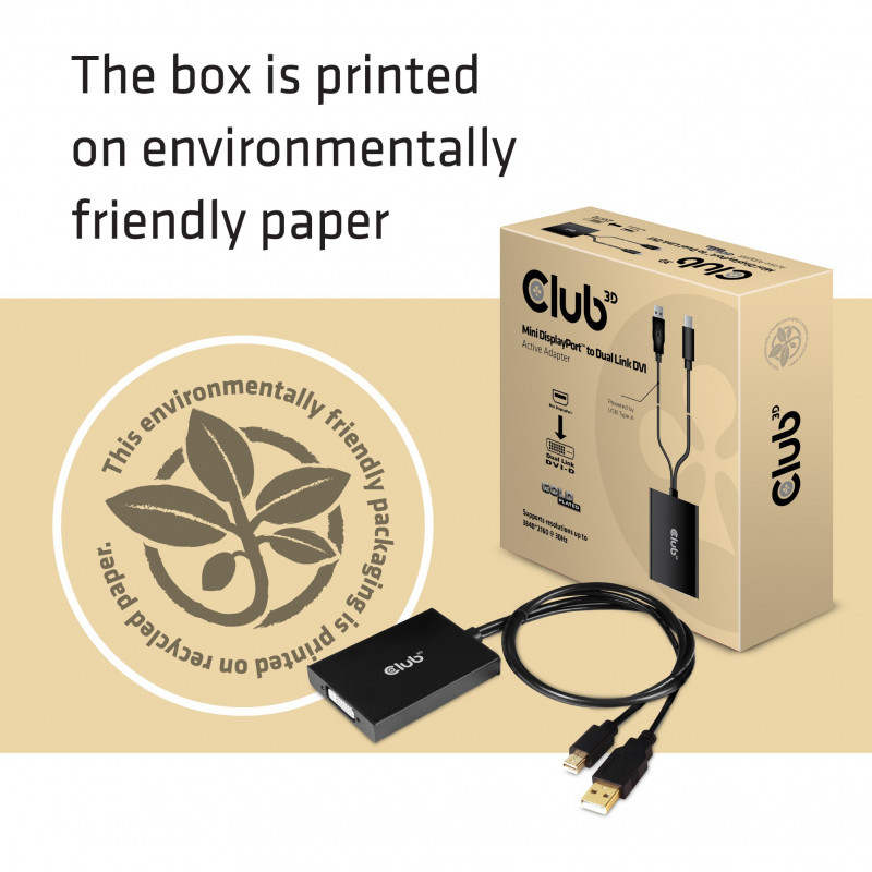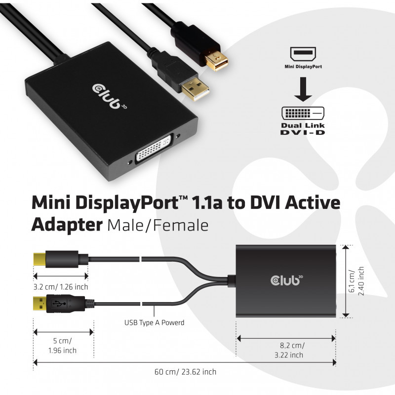 "CLUB3D MiniDisplayPort 1.2a to Dual Link DVI-D Active Adapter. Cable length: 0.6 m, Connector 1: MiniDP/USB-A, Connector 2: DVI-D. Compliance certificates: RoHS, Certification: CE, FCC, CE EMI. Weight: 109 g, Width: 83 mm, Depth: 61 mm. Package width: 145 mm, Package depth: 145 mm, Package height: 45 mm"\n"MiniDisplayPort 1.2a to Dual Link DVI-D Active Adapter
