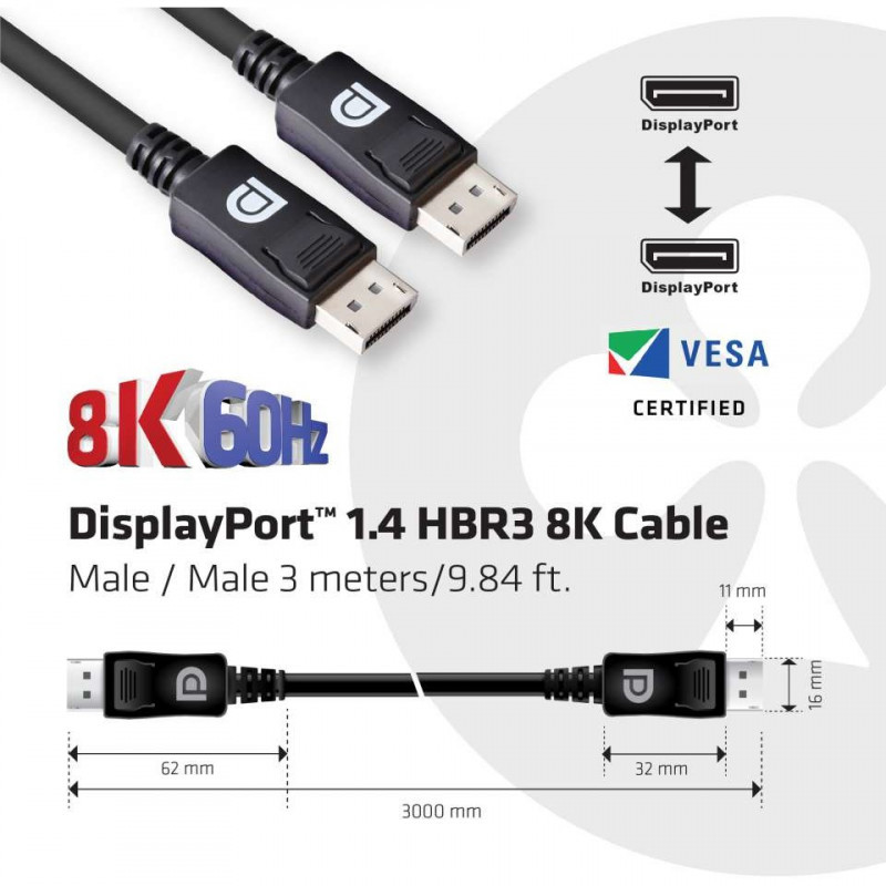 "CLUB3D DisplayPort 1.4 HBR3 8K 28AWG Cable M/M 3m /9.84ft. Cable length: 3 m, Connector 1: DisplayPort, Connector 2: DisplayPort. Compliance certificates: RoHS, Certification: Rohs, WEEE, CE. Weight: 219 g. Package width: 210 mm, Package depth: 50 mm, Package height: 210 mm. Quantity per pack: 1 pc(s)"\n"The Club 3D DisplayPort™ 1.4 HBR3 8K cable enables the connection of your DisplayPort™ supported (Gaming) PC or Laptop to an (Ultra) High Resolution