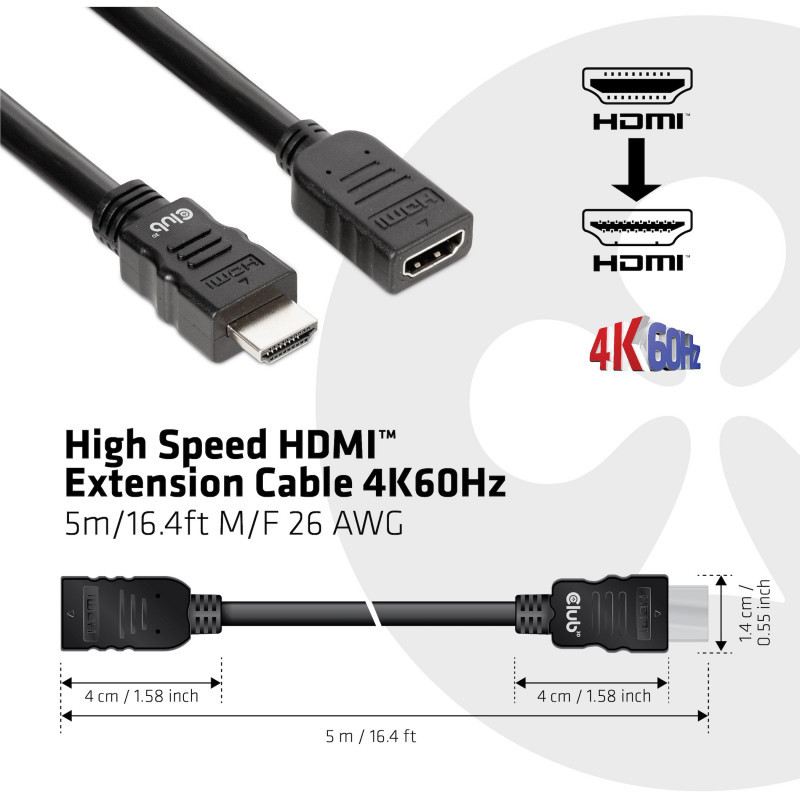 "CLUB3D High Speed HDMI™ Extension Cable 4K60Hz M/F 5m/16.4ft 26 AWG. Cable length: 5 m, Connector 1: HDMI Type A (Standard), Connector 1 gender: Male, Connector 2: HDMI Type A (Standard), Connector 2 gender: Female, Connector contacts plating: Gold, HDMI version: 2.0, 3D, Data transfer rate: 18 Gbit/s, Product colour: Black"\n"The Club 3D CAC-1325 High Speed HDMI™ Extension Cable, 4K60Hz UHD enables you to extend your existing HDMI™ cable length by 5 meters / 16.4 Feet. Nowadays we have many devices that we want to connect to our TV which makes this product a great solution because it creates flexibility for the placing of such devices.