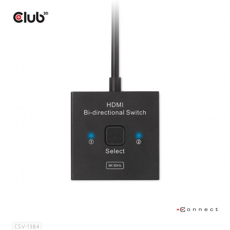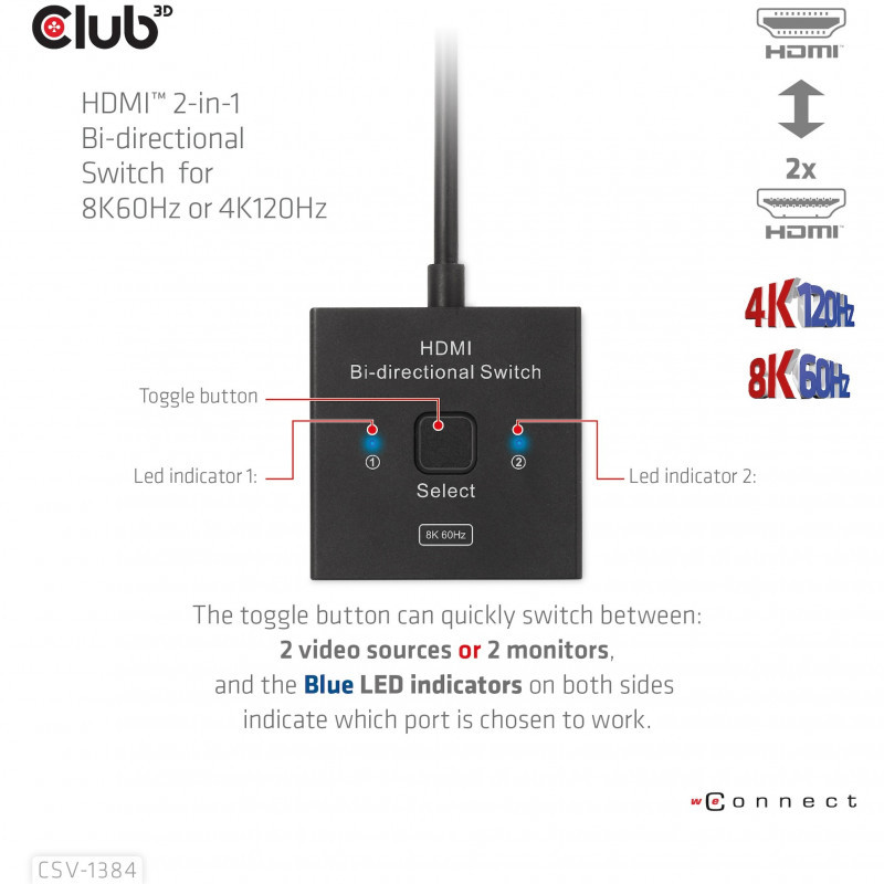 "CLUB3D HDMI 2-in-1 Bi-directional Switch for 8K60Hz or 4K120Hz. Paper/cardboard packaging weight: 45 g, Plastic packaging weight: 2 g. Harmonized System (HS) code: 8473 3020"\n"The Club 3D CSV-1384 is a HDMI™ 2-in-1 Bi-directional Switch for 8K60Hz or 4K120Hz. It can switch either of two sources to one display or switch one source to either of two displays. Press the switch button to select channel 1 or channel 2. With a piece of 0.5m / 1.64 ft length fixed HDMI™ cable (pigtail), this Switch not only reduces cost but also saves time for customers. This kind of HDMI™ Switcher routes high definition video (in multiple resolutions and up to 8K60Hz) and digital audio from the sources to display units."