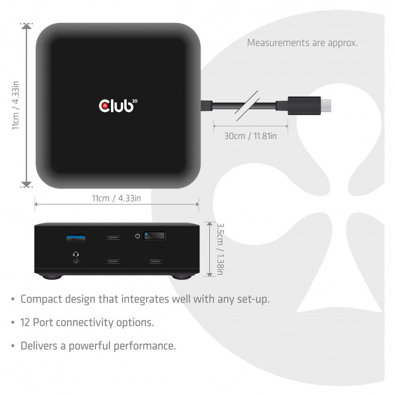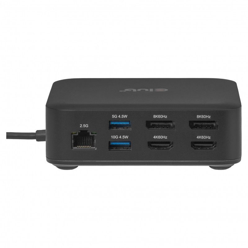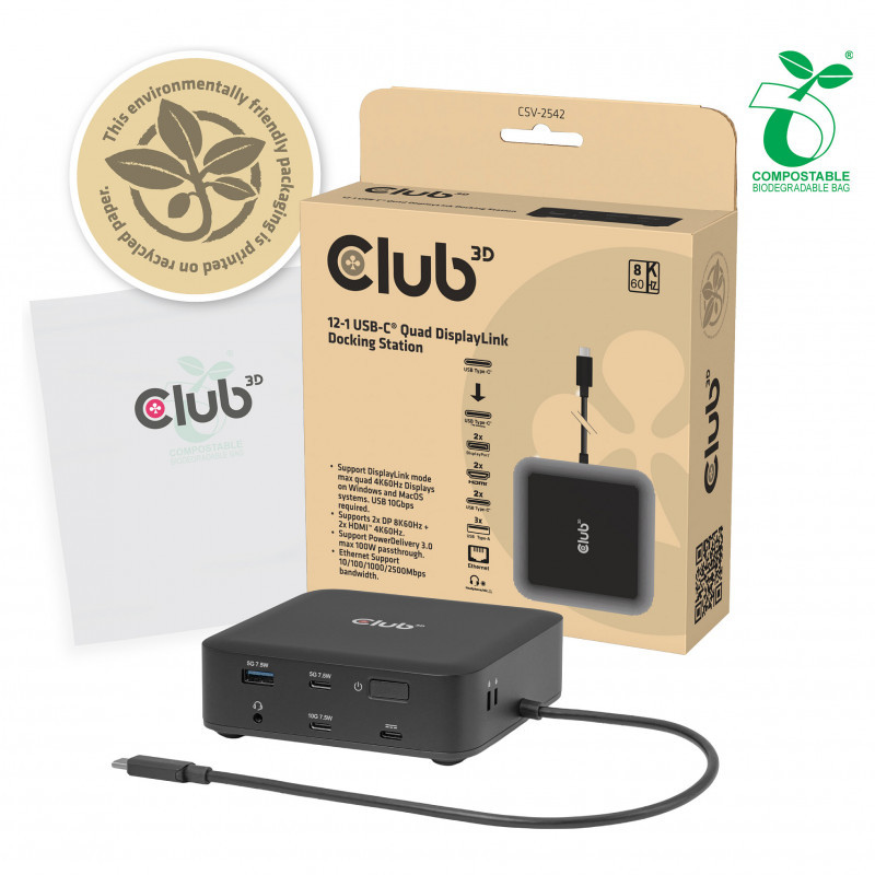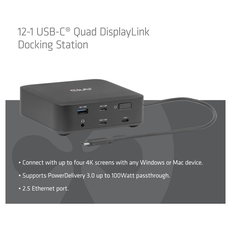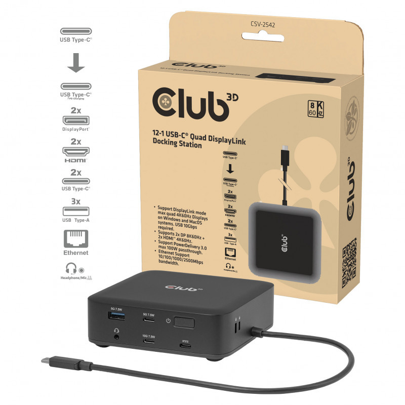 "CLUB3D CSV-2542 12-1 USB-C® Quad DisplayLink Docking Station 2x Display- Port™ 8K60Hz + 2x HDMI™ 4K60Hz PD3.0 100Watt Ethernet 2.5G. Connectivity technology: Docking, Host interface: USB 3.2 Gen 2 (3.1 Gen 2) Type-C, USB Power Delivery up to: 100 W. Ethernet LAN data rates: 10,100,1000,2500 Mbit/s. Product colour: Black, Data transfer rate: 10 Gbit/s, HD type: 8K Ultra HD. Windows operating systems supported: Windows 11, Mac operating systems supported: Mac OS X 15.0 Sequoia. Width: 110 mm, Depth: 110 mm, Height: 35 mm"\n"Description: