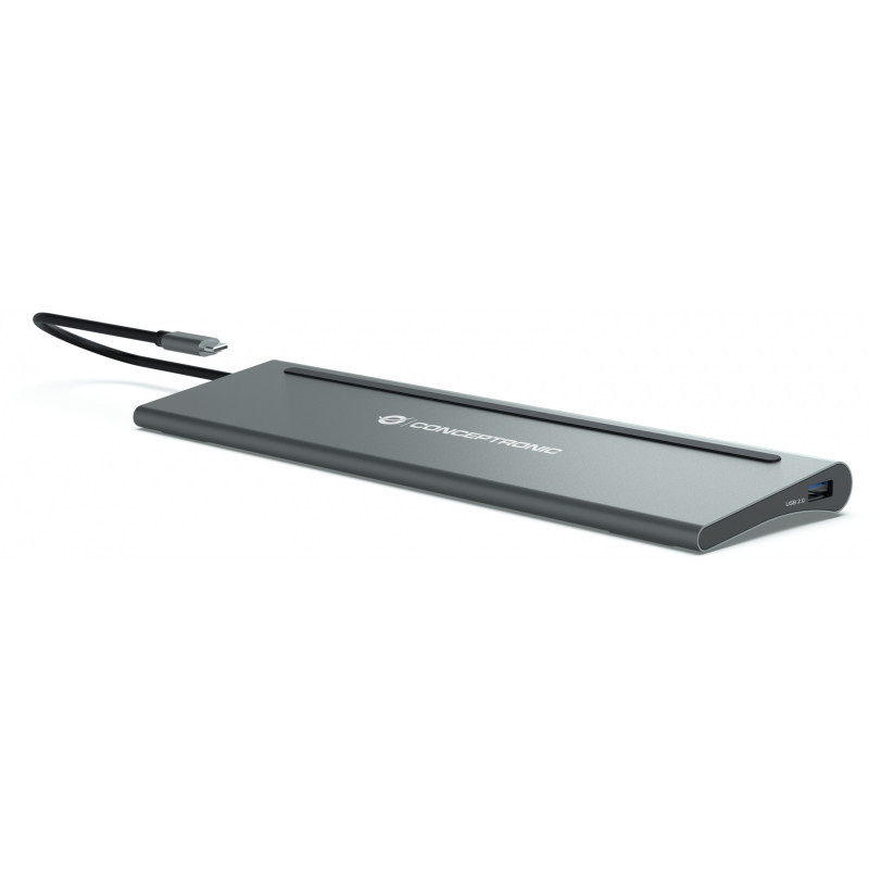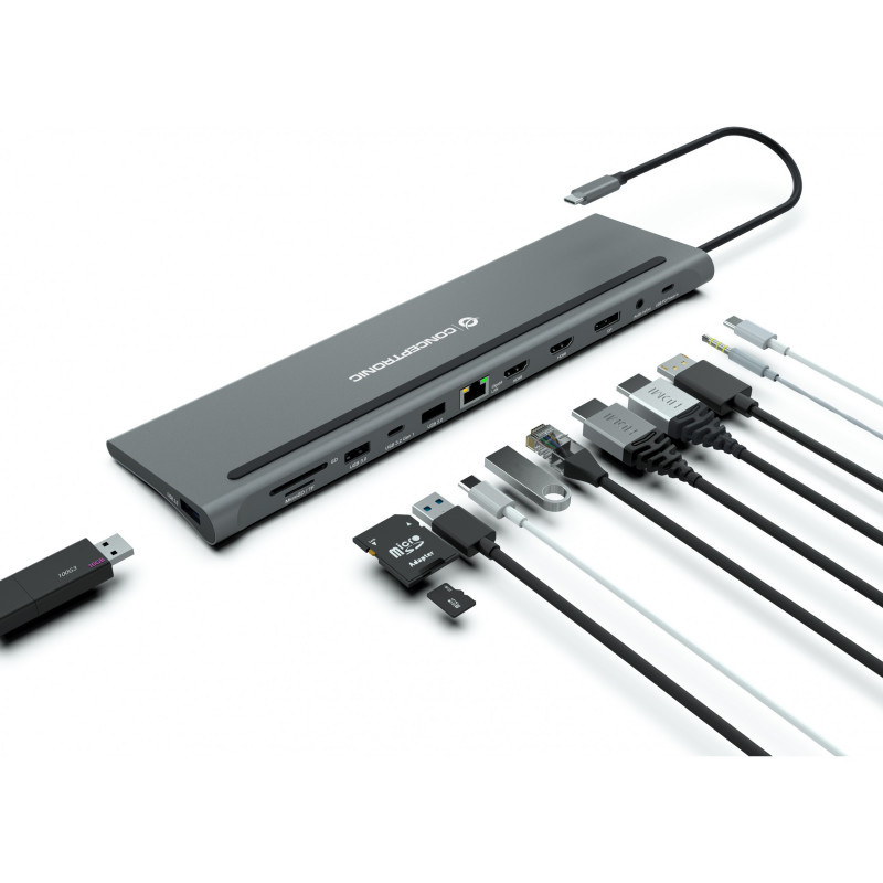 "Conceptronic DONN17G. Connectivity technology: Wired, Host interface: USB 3.2 Gen 1 (3.1 Gen 1) Type-C, USB Power Delivery up to: 100 W. Ethernet LAN data rates: 10,100,1000 Mbit/s. Product colour: Grey, Compatible memory cards: MicroSD (TransFlash), SD, Data transfer rate: 5 Gbit/s. Power source type: USB, Power connector: USB Type-C, USB cable length: 0.18 m. Windows operating systems supported: Windows 10, Windows 7, Windows 8, Windows Vista, Windows XP, Mac operating systems supported: Mac OS X 10.10 Yosemite, Mac OS X 10.11 El Capitan, Mac OS X 10.12 Sierra, Mac OS X 10.13 High..., Mobile operating systems supported: Android"\n"This 12-in-1 docking station makes it possible to expand your device’s USB Type-C capacity with HDMI/DisplayPort/USB-C PD/USB-C data/USB 3.0/USB 2.0/SD/TF/GbE/AUX ports. The adapter provides an easy way to add HDTV, or equipment such as a monitor or projector to any USB-C device such as a smartphone, portable gaming console, MacBook, Chromebook Pixel or any similar late-model laptop with USB-C ports. The multiport video adapter lets you mirror or extend content on three additional monitors simultaneously (2 x HDMI, 1 x DisplayPort), creating a triple-screen workstation. Perfect for home entertainment, office presentations and classroom teaching.