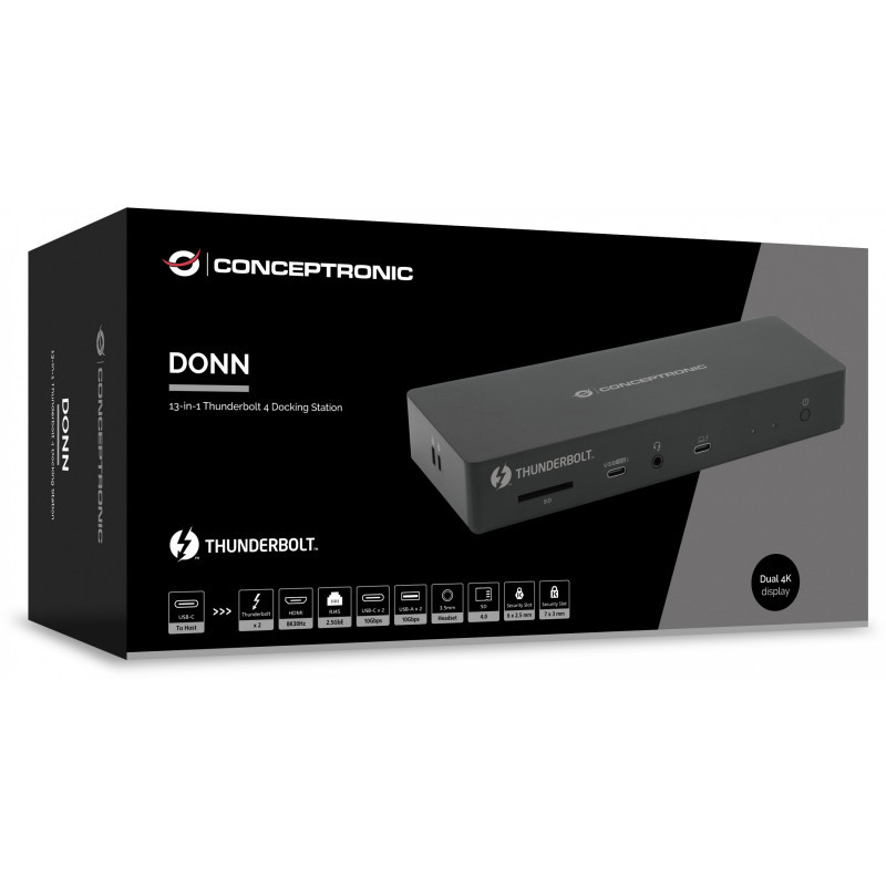 "Conceptronic DONN30B 13-in-1 Thunderbolt 4 Docking Station. Connectivity technology: Wired, Host interface: Thunderbolt 4, USB Power Delivery up to: 96 W. Ethernet LAN data rates: 10,100,1000,2000,2500 Mbit/s, Networking standards: IEEE 802.3bz. Product colour: Black, Compatible memory cards: SD, SDHC, SDXC, Data transfer rate: 40 Gbit/s. Windows operating systems supported: Windows 10, Windows 10 Education, Windows 10 Education x64, Windows 10 Enterprise, Windows 10..., Mac operating systems supported: Mac OS X 11.0 Big Sur, Mac OS X 12.0 Monterey, Mac OS X 13.0 Ventura, Mac OS X 14.0 Sonoma, Mac OS.... Width: 199 mm, Depth: 74.8 mm, Height: 31 mm"\n"Transform your digital experience with the premium 13-in-1 Thunderbolt 4 Docking Station—the ultimate connectivity solution engineered for professionals who demand excellence. One port becomes your gateway to endless possibilities: enjoy visual brilliance with dual extended displays across macOS and Windows, and stunning clarity with HDMI output up to 8K at 30Hz, enabling advanced multi-monitor setups for maximum productivity.
