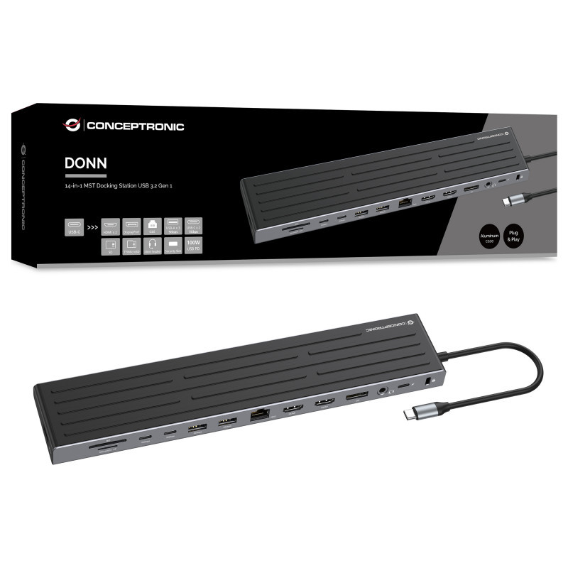 "Conceptronic DONN32B 14-in-1 MST Docking Station USB 3.2 Gen 1, HDMI x 2, DP, GbE LAN, USB-A 5Gbps x 3, USB-C 5Gbps x 2, SD, TF/MicroSD, 3.5mm headset, Security Slot, 100W USB PD. Connectivity technology: Wired, Host interface: USB 3.2 Gen 1 (3.1 Gen 1) Type-C, USB Power Delivery up to: 100 W. Ethernet LAN data rates: 10,100,1000 Mbit/s, Networking standards: IEEE 802.3ab. Product colour: Grey, Silver, Compatible memory cards: MicroSD (TransFlash), HD type: 4K Ultra HD. Power source type: USB, USB cable length: 0.18 m. Windows operating systems supported: Windows 10, Windows 10 Education, Windows 10 Education x64, Windows 10 Enterprise, Windows 10..., Mac operating systems supported: Mac OS X 10.10 Yosemite, Mac OS X 10.11 El Capitan, Mac OS X 10.12 Sierra, Mac OS X 10.13 High..., Mobile operating systems supported: Android 10.0, Android 11.0, Android 12.0, Android 13.0, Android 14.0, Android 5.0, Android 5.1,..."\n"Unlock full workstation potential with this high-performance 14-in-1 docking station. Designed for professionals who demand more, it supports triple extended displays on Windows via HDMI and DisplayPort with crisp 4K@60Hz resolution.