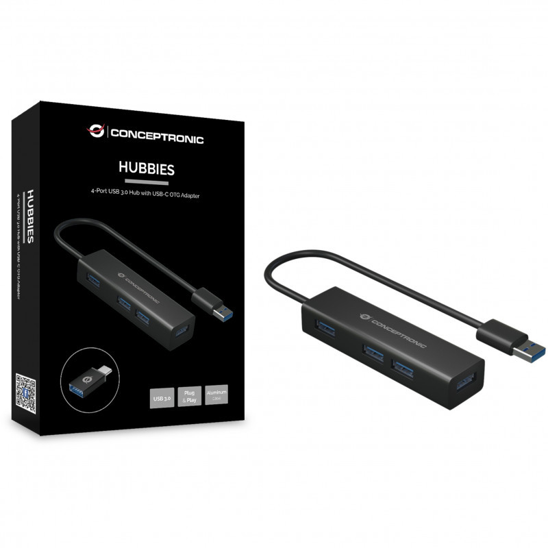 "Conceptronic 4-Port USB 3.0 Aluminum Hub with USB-C to USB-A Adapter. Host interface: USB 3.2 Gen 1 (3.1 Gen 1) Type-A, Hub interfaces: USB 3.2 Gen 1 (3.1 Gen 1) Type-A. Data transfer rate: 5000 Mbit/s, Product colour: Black, Country of origin: China. Power supply type: USB. Windows operating systems supported: Windows 10, Windows 7, Windows 8, Windows 8.1, Windows Vista, Windows XP, Mac operating systems supported: Mac OS X 10.10 Yosemite, Mac OS X 10.11 El Capitan, Mac OS X 10.12 Sierra, Mac OS X 10.13 High.... Width: 87.5 mm, Depth: 23.4 mm, Height: 16.5 mm"\n"This 4 ports USB 3.0 hub makes it possible to expand your netbook, notebook or PC with 4 extra USB 3.0 ports with only using one free USB 3.0 port! You can easily add up to 4 USB devices or gadgets to your netbook, notebook or PC.