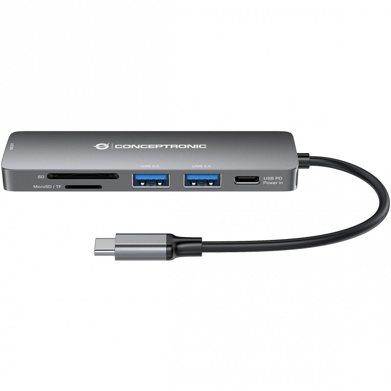 "Conceptronic DONN11G 6-in-1 USB 3.2 Gen 1 Docking Station, HDMI, 100W USB PD, USB 3.0, USB 2.0, SD, TF/MicroSD. Connectivity technology: Wired, Host interface: USB 3.2 Gen 1 (3.1 Gen 1) Type-C, USB Power Delivery up to: 100 W. Product colour: Grey, Compatible memory cards: MicroSD (TransFlash), SD, Data transfer rate: 5 Gbit/s. Power source type: USB, USB cable length: 0.12 m. Windows operating systems supported: Windows 10, Windows 10 Education, Windows 10 Education x64, Windows 10 Enterprise, Windows 10..., Mac operating systems supported: Mac OS X 10.10 Yosemite, Mac OS X 10.11 El Capitan, Mac OS X 10.12 Sierra, Mac OS X 10.13 High..., Mobile operating systems supported: Android 10.0, Android 11.0, Android 12.0, Android 5.0, Android 5.1, Android 6.0, Android 7.0,.... Width: 30.2 mm, Depth: 107.6 mm, Height: 10.7 mm"\n"This 6-in-1 USB 3.2 Gen 1 Docking Station makes it possible to expand your device’s USB Type-C capacity with HDMI/USB-C PD/USB 3.0/USB 2.0 ports and card readers (SD, MicroSD/TF).