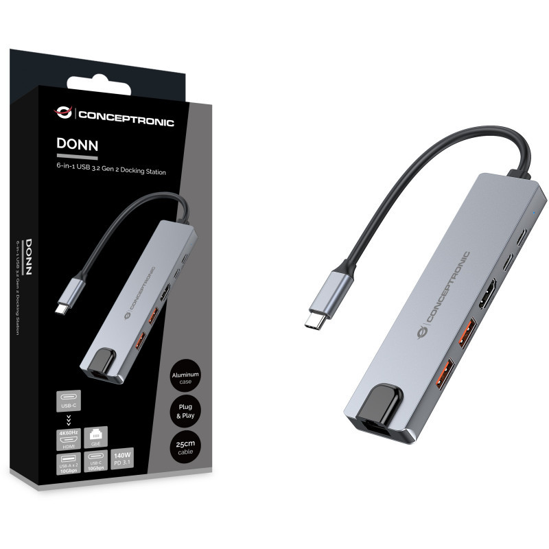 "Conceptronic DONN29G 6-in-1 USB 3.2 Gen 2 Docking Station, 4K60Hz HDMI, USB-A 10Gbps x 2, USB-C 10Gbps, GbE LAN, 140W USB PD 3.1. Connectivity technology: Wired, Host interface: USB 3.2 Gen 2 (3.1 Gen 2) Type-C, USB Power Delivery up to: 140 W. Ethernet LAN data rates: 10,100,1000 Mbit/s, Networking standards: IEEE 802.3ab. Product colour: Grey, Data transfer rate: 10 Gbit/s, Housing material: Aluminium. Power source type: USB, USB cable length: 0.25 m. Windows operating systems supported: Windows 10, Windows 10 Education, Windows 10 Education x64, Windows 10 Enterprise, Windows 10..., Mac operating systems supported: Mac OS X 10.10 Yosemite, Mac OS X 10.11 El Capitan, Mac OS X 10.12 Sierra, Mac OS X 10.13 High..., Mobile operating systems supported: Android 10.0, Android 11.0, Android 12.0, Android 13.0, Android 14.0, Android 5.0, Android 5.1,..."\n"This 6-in-1 Docking Station expands your device’s USB Type-C functionality with HDMI, USB-C PD, USB-C (10Gbps), USB-A (10Gbps), and RJ45 ports. It’s an ideal solution for MacBooks or Windows laptops with built-in wireless connectivity but no Ethernet port. Featuring a Gigabit Ethernet connection, it ensures fast and reliable wired network access. Additionally, the docking station supports up to 140W power delivery for compatible laptops or tablets with USB-C PD 3.1 support.