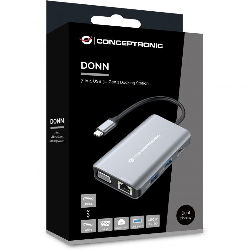 "Conceptronic DONN21G. Connectivity technology: Wired, Host interface: USB 3.2 Gen 1 (3.1 Gen 1) Type-C, USB Power Delivery up to: 100 W. Ethernet LAN data rates: 1000 Mbit/s. Product colour: Grey, HD type: 4K Ultra HD, Maximum digital resolution: 3840 x 2160 pixels. Power cable length: 0.2 m. Windows operating systems supported: Windows 10, Windows 11, Windows 7, Windows 8, Windows Vista, Windows XP, Mac operating systems supported: Mac OS X 10.10 Yosemite, Mac OS X 10.11 El Capitan, Mac OS X 10.12 Sierra, Mac OS X 10.13 High..., Other operating systems supported: Android, ChromeOS"\n"This 7-in-1 Docking Station makes it possible to expand your device’s USB Type-C capacity with HDMI/VGA/USB-C PD/USB 3.0/GbE ports. The docking station provides an easy way to add HDTV, or equipment such as a monitor or projector to any USB-C device such as a smartphone, portable gaming console, MacBook, Chromebook Pixel or any similar late-model laptop with USB-C ports. The multiport video adapter lets you mirror or extend content on two additional monitors simultaneously (1 x HDMI, 1 x VGA), creating a dual-screen workstation. Perfect for home entertainment, office presentations and classroom teaching."