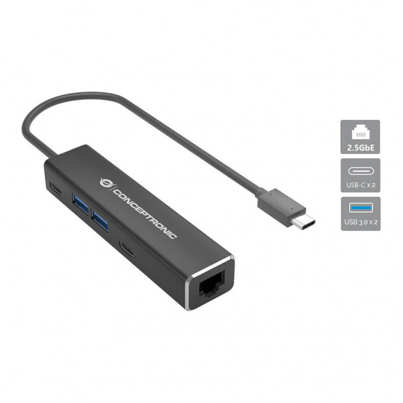 "Conceptronic ABBY14B 2.5G Ethernet USB 3.2 Gen 1 Adapter with USB Hub, 2.5GbE, USB-A x 2, USB-C x 2. Connectivity technology: Wired, Host interface: USB 3.2 Gen 1 (3.1 Gen 1) Type-C. Ethernet LAN data rates: 10,100,1000,2500 Mbit/s, Networking standards: IEEE 802.1Q, IEEE 802.1p, IEEE 802.3, IEEE 802.3ab, IEEE 802.3az, IEEE 802.3bz, IEEE 802.3u. Product colour: Grey, Housing material: Aluminium, Country of origin: China. Power source type: USB, USB cable length: 0.23 m. Windows operating systems supported: Windows 10, Windows 10 Education, Windows 10 Education x64, Windows 10 Enterprise, Windows 10..., Mac operating systems supported: Mac OS X 10.10 Yosemite, Mac OS X 10.11 El Capitan, Mac OS X 10.12 Sierra, Mac OS X 10.13 High..., Mobile operating systems supported: Android 10.0, Android 11.0, Android 12.0, Android 13.0, Android 5.0, Android 5.1, Android 6.0,..."\n"The 2.5G Ethernet USB 3.2 Gen 1 Adapter with USB Hub allows you to connect to the internet easily through the built-in USB port on your laptop. This is an ideal solution for MacBook or other Windows computers that may have wireless built-in but don’t come with an Ethernet port. With its 2.5 Gigabit Ethernet connection, it enables lightning-fast data transfers, at speeds 2.5 times faster than Gigabit Ethernet. The adapter also combines a regular USB hub. So you can connect external USB peripherals, such as an MP3 player, digital camera, printer, or pen drive.