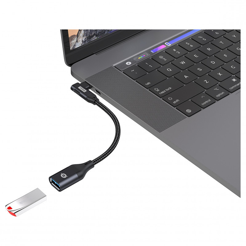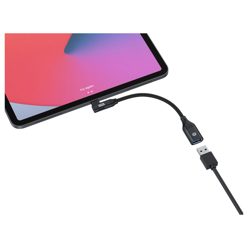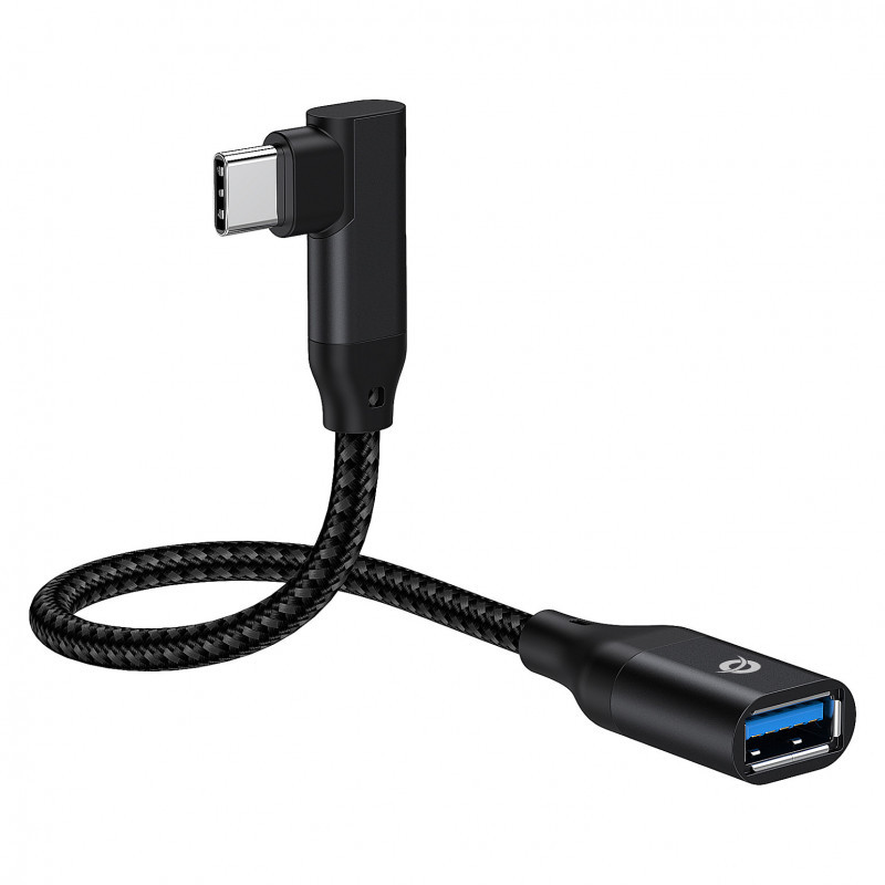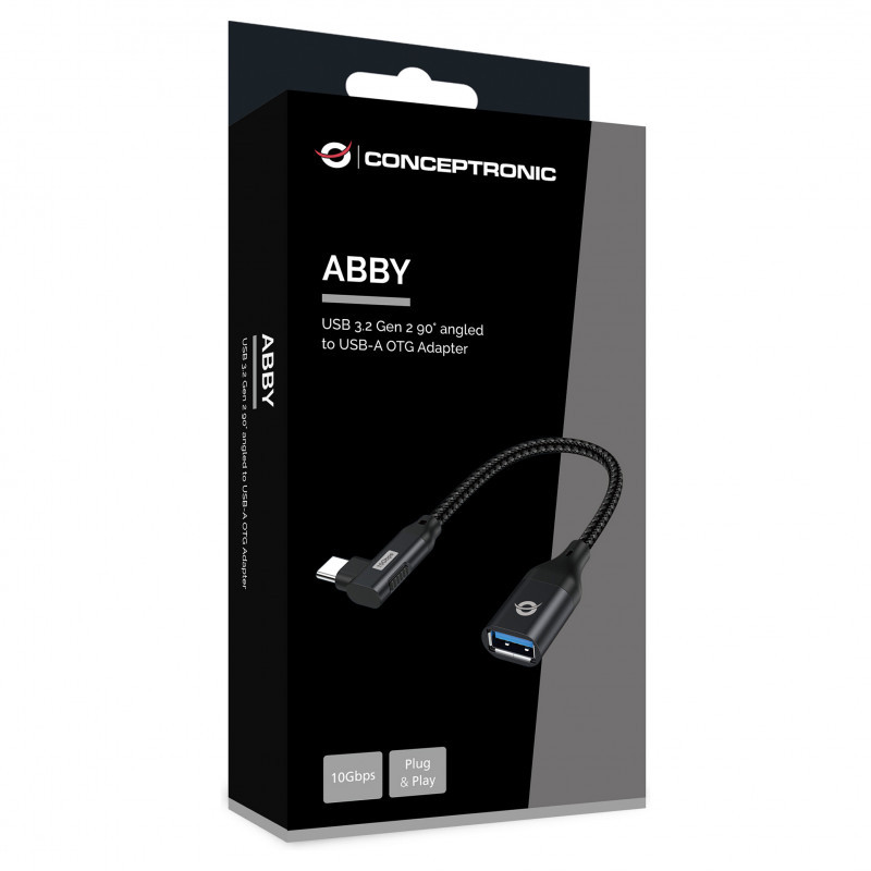 "Conceptronic ABBY19B USB 3.2 Gen 2 90° angled to USB-A OTG Adapter. Connector 1: USB-C, Connector 2: USB-A. Product colour: Black"\n"This USB-C OTG Adapter provides convenient data syncing and charging to any USB-C device such as a smartphone, portable gaming console, MacBook, Chromebook Pixel or any similar late-model laptop with USB-C ports. The adapter also provides a means of connecting devices such as external hard drives, USB flash drive or a mouse and keyboard using your existing cable, removing the need to purchase new equipment. Moreover, the adapter supports up to 3.0 Amps of power output for charging USB-C devices. A great economical choice to enhance daily life."