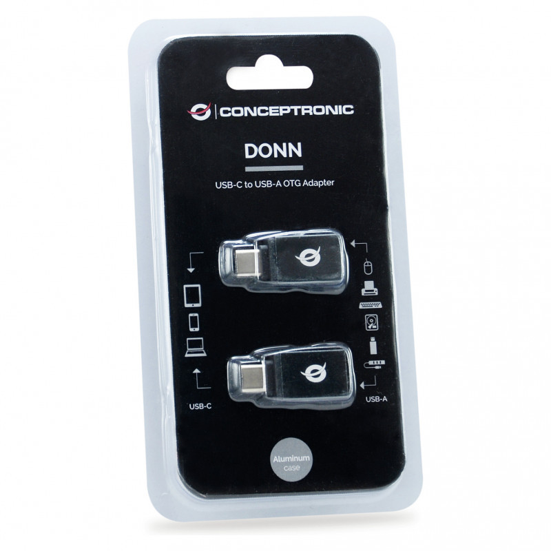 "Conceptronic DONN USB-C to USB-A OTG Adapter 2-Pack. Connector 1: USB 3.1 Gen 1 Type-C, Connector 2: USB 3.1 Gen 1 Type-A. Product colour: Black"\n"This USB-C OTG Adapter provides convenient data syncing and charging to any USB-C device such as a smartphone, portable gaming console, MacBook, Chromebook Pixel or any similar late-model laptop with USB-C ports. The adapter also provides a means of connecting devices such as external hard drives, USB flash drive or a mouse and keyboard using your existing cable, removing the need to purchase new equipment. A great economical choice to enhance daily life."