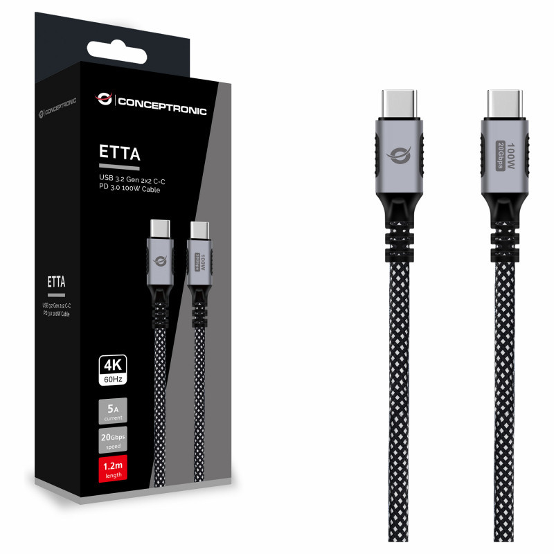 "Conceptronic ETTA07B12 USB 3.2 Gen 2x2 C-C PD 3.0 100W Cable 1.2M, 20V 5A, 20Gbps, 4K60Hz, E-Mark. Cable length: 1.2 m. Connector 1: USB C, Connector 2: USB C, USB version: USB 3.2 Gen 2x2, Maximum data transfer rate: 20 Gbit/s, Product colour: Black"\n"The Conceptronic USB-C cable is designed for high-speed performance and reliable power delivery. Supporting USB 3.2 Gen 2x2 with data transfer speeds of up to 20Gbps, it enables fast and efficient file transfers. Built with PD 3.0 technology and an integrated E-Mark chipset, the cable delivers up to 100W (20V/5A) of charging power, making it ideal for laptops, tablets, and other power-hungry devices.