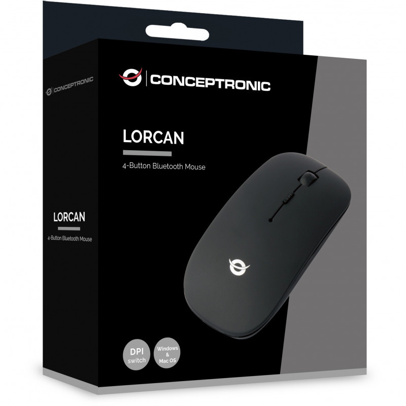 "Conceptronic LORCAN01B 4-Button Bluetooth Mouse. Form factor: Ambidextrous. Movement detection technology: Optical, Device interface: Bluetooth, Movement resolution: 1600 DPI, Buttons type: Pressed buttons, Buttons quantity: 4, Scroll type: Wheel. Power source: Batteries. Product colour: Black"\n"This Bluetooth mouse provides a very comfortable experience for interfacing with your computer, including an extra-smooth scroll wheel. Simply pair the mouse with your Bluetooth-enabled computer, without needing a dedicated wireless USB receiver like many traditional wireless devices. The cleverly-designed mouse comes with a DPI switch which can instantly adjust sensitivity, and rubberized finishing provides superior grip and comfort. Thanks to the ergonomic design the mouse can be used for both right and left handed users."