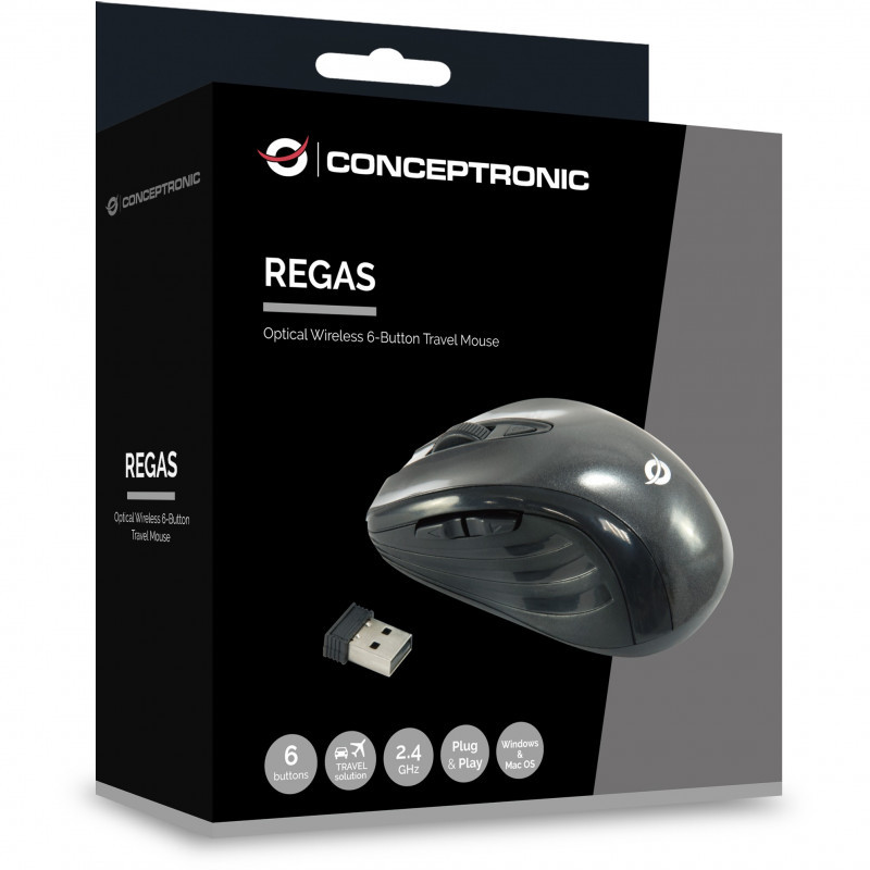 "Conceptronic CLLM5BTRVWL 6-Button Wireless Travel Mouse. Form factor: Right-hand. Movement detection technology: Optical, Device interface: RF Wireless, Movement resolution: 1600 DPI, Buttons type: Pressed buttons, Buttons quantity: 6, Scroll type: Wheel. Power source: Batteries. Product colour: Black"\n"This 6-button wireless optical travel mouse uses the 2.4GHz frequency which avoids interference with other wireless devices. The nano USB receiver can be stored in the bottom of the mouse or just leave it in the USB port of your notebook/netbook. This mouse also has a DPI switch to change between 800 and 1600 DPI. Together with the ergonomic shape, the back- and forward buttons make this mouse is a real must have!"