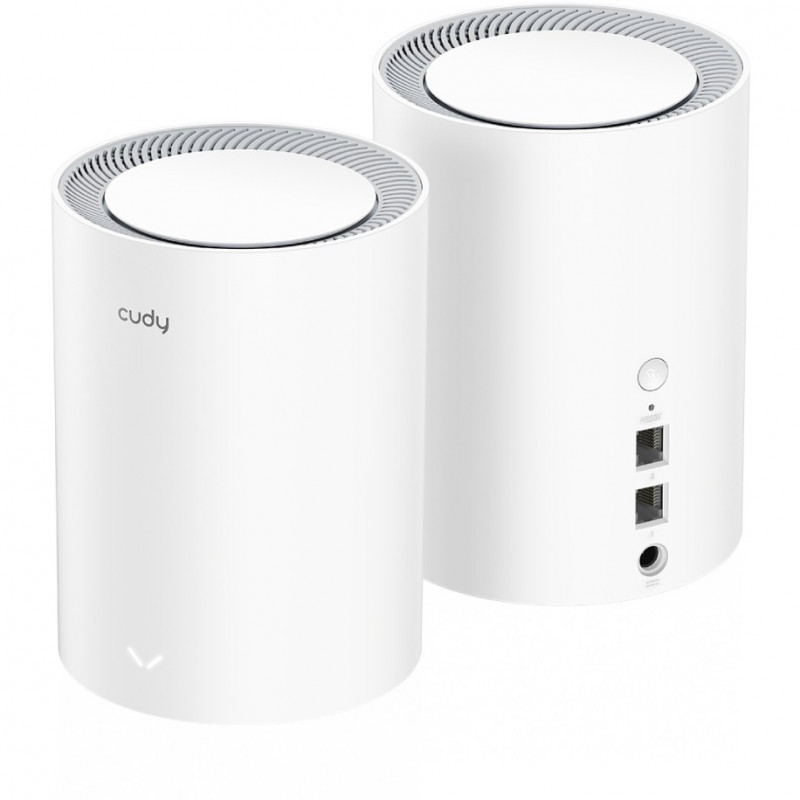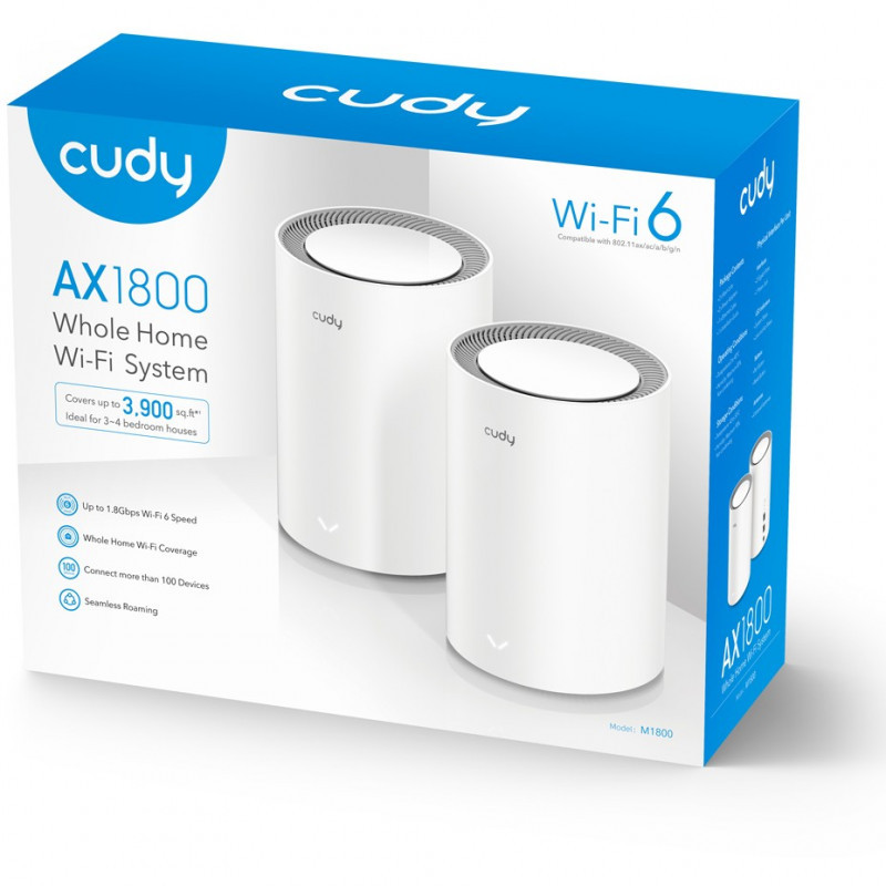 "Cudy AX1800. Product colour: White, Antenna type: Internal, Product type: Mesh system. Wi-Fi band: Dual-band (2.4 GHz / 5 GHz), Top Wi-Fi standard: Wi-Fi 6 (802.11ax), Wi-Fi standards: 802.11a, 802.11b, 802.11g, Wi-Fi 4 (802.11n), Wi-Fi 5 (802.11ac), Wi-Fi 6 (802.11ax). Internal memory: 32 MB, Flash memory: 256 MB. Number of products included: 2 pc(s), Number of units included: 2 pc(s)"\n