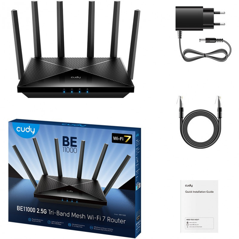 "Cudy WR11000. WAN connection type: RJ-45. Wi-Fi band: Tri-band (2.4 GHz / 5 GHz / 6 GHz), Top Wi-Fi standard: Wi-Fi 7 (802.11be), WLAN data transfer rate (max): 5765 Mbit/s. Ethernet LAN interface type: 2.5 Gigabit Ethernet, Ethernet LAN data rates: 10,100,1000,2500 Mbit/s, Networking standards: IEEE 802.11a, IEEE 802.11ac, IEEE 802.11ax, IEEE 802.11b, IEEE 802.11be, IEEE 802.11g, IEEE 802.11n. Security algorithms: WPA-PSK, WPA2-PSK, WPA3-SAE. Product type: Tabletop router, Product colour: Black, LED indicators: LAN, System, WLAN, WPS"\n"A tri-band WiFi 7 router with an aggregate of 10.6 Gbps speed and four 2.5G ports, catering to latency-sensitive, speed-demanding, and large-scale scenarios.