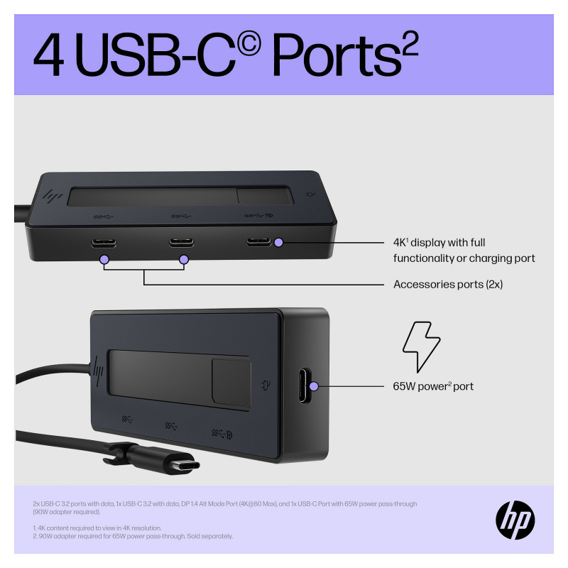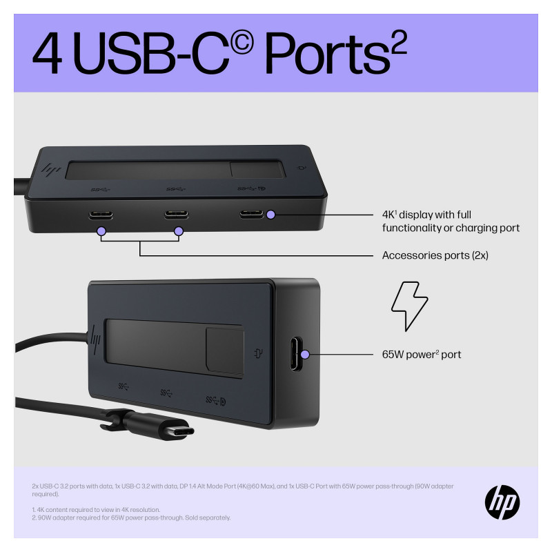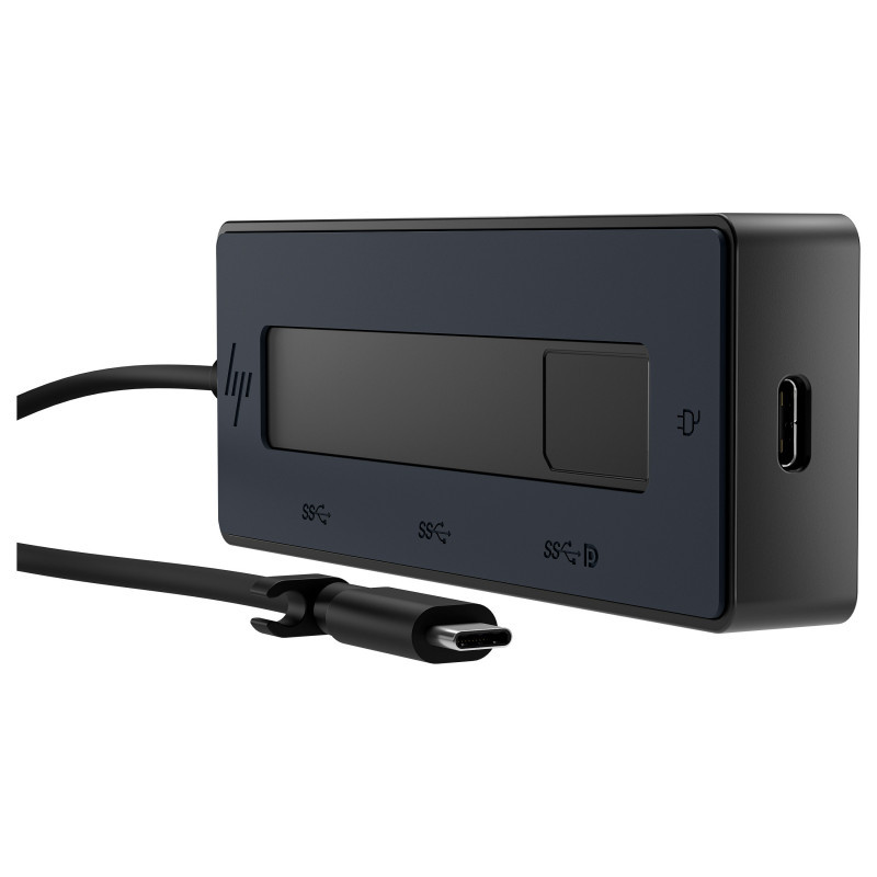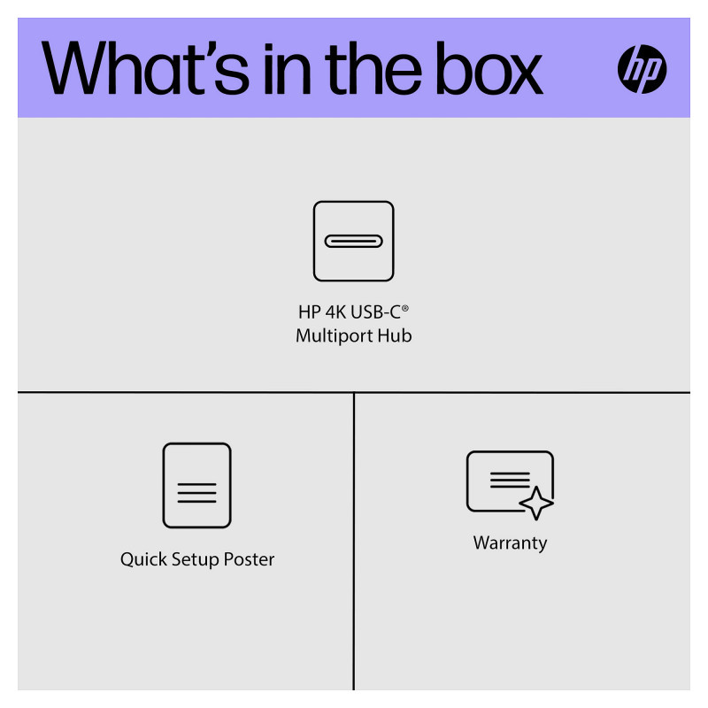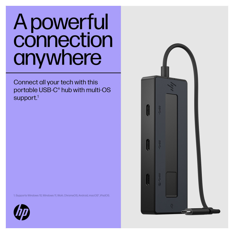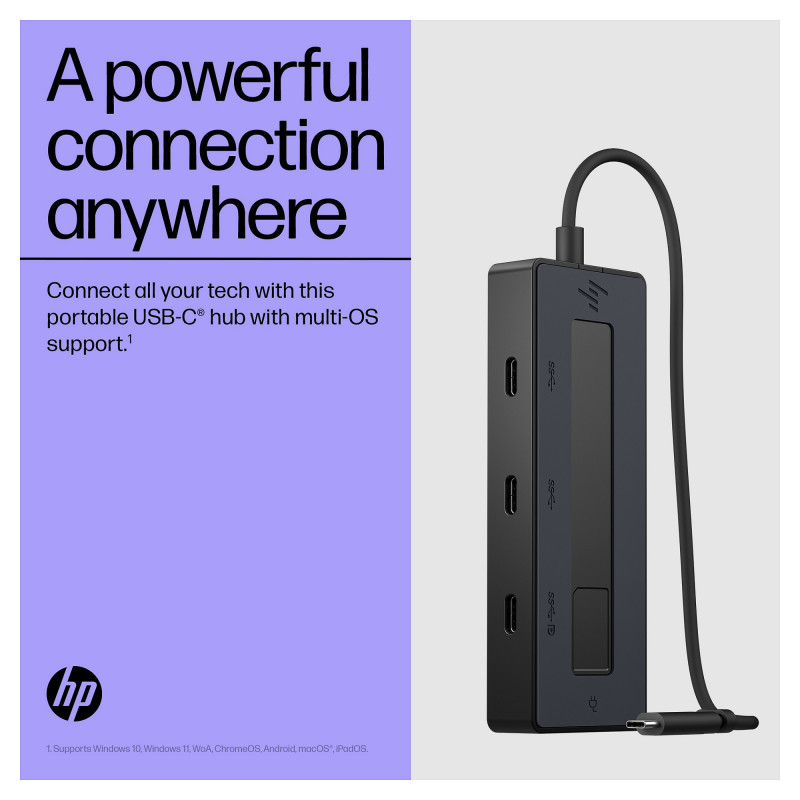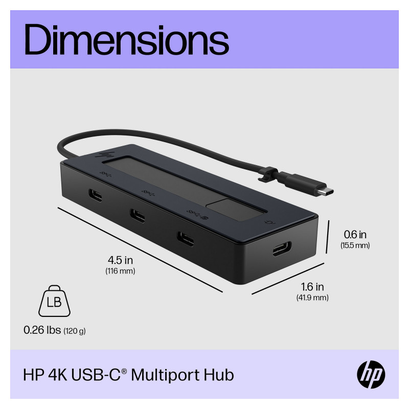"HP 4K USB-C Multiport Hub. Host interface: USB Type-C, USB Power Delivery up to: 65 W. Product colour: Black, Hub interfaces: USB Type-C, Country of origin: China. Windows operating systems supported: Windows 10, Windows 11, Other operating systems supported: Android, ChromeOS, iPadOS. Width: 116 mm, Depth: 41.9 mm, Height: 15.5 mm. Package width: 174.5 mm, Package depth: 59 mm, Package height: 40 mm"\n"A Powerful Connection Anywhere