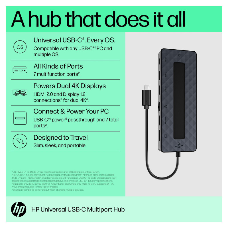 Unlock new possibilities with the HP Universal USB-C Multiport hub, now supporting any USB-C®[1] compatible PC. 7 ports, 1 power and data passthrough cable, and many peripherals to plug and play however you like. It also supports dual 4K[2] displays via HDMI 2.0 and 1 DisplayPort™ 1.2. This hub is all you need to stay connected."