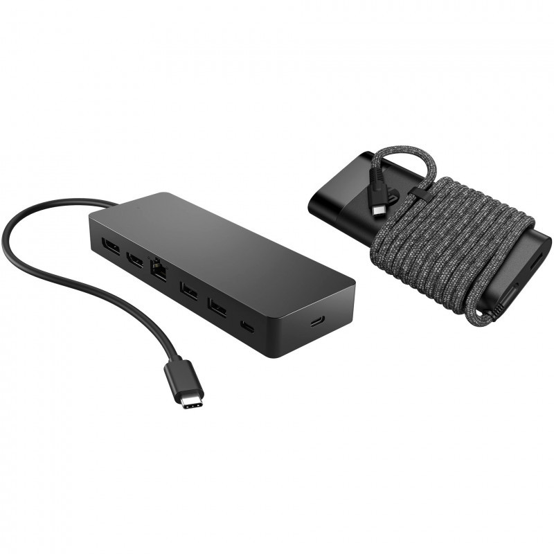 "HP Universal USB-C Hub and Laptop Charger Combo. Connectivity technology: Wired, Host interface: USB 3.2 Gen 1 (3.1 Gen 1) Type-C, USB Power Delivery up to: 65 W. Product colour: Black, Colour name: Black, Country of origin: China. Power source type: USB, Power connector: USB Type-C, Power supply: 65 W. Windows operating systems supported: Windows 10, Windows 11, Mac operating systems supported: MacOS, Other operating systems supported: ChromeOS. Width: 150 mm, Depth: 55 mm, Height: 21.5 mm"\n"A Hub That Does it All