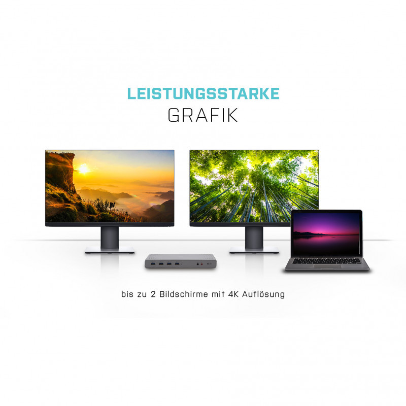 Enhance your notebook, tablet or smartphone, utilising USB-C or USB-A connectivity. This Thunderbolt 3 compatible USB-C dual monitor docking station features the latest DisplayLink DL9650 chipset and offers the flexibility of both USB-C and USB-A host interfaces (cables included).