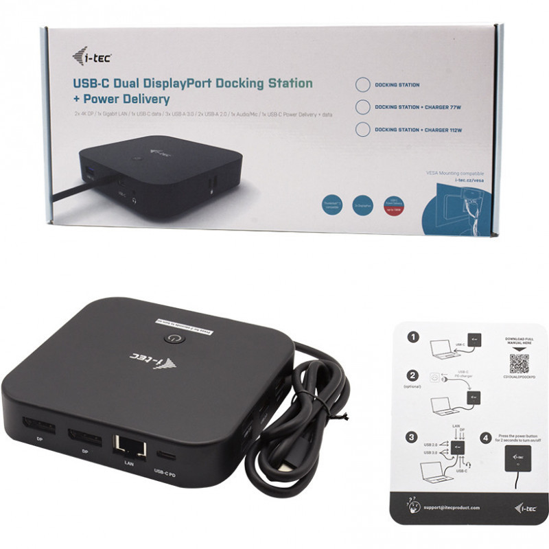 "i-tec USB-C Dual Display Docking Station with Power Delivery 100 W. Connectivity technology: Wired, Host interface: USB 3.2 Gen 1 (3.1 Gen 1) Type-C, USB Power Delivery up to: 100 W. Ethernet LAN data rates: 10,100,1000 Mbit/s. Product colour: Black, Cable lock slot type: Kensington. Power cable length: 1 m. Other operating systems supported: Android"\n"This docking station is designed to be used with any laptop, tablet or smartphone regardless of type, brand or operating system. All that is needed is for your laptop/tablet/phone to have a free Thunderbolt 3 or USB-C port capable of transmitting video signal.