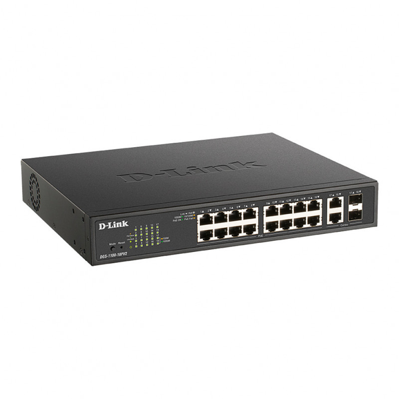 "D-Link DGS-1100-18PV2. Switch type: Managed, Switch layer: L2. Basic switching RJ-45 Ethernet ports type: Gigabit Ethernet (10/100/1000), Basic switching RJ-45 Ethernet ports quantity: 16. Full duplex. Switching capacity: 36 Gbit/s. Networking standards: IEEE 802.3, IEEE 802.3ab, IEEE 802.3af, IEEE 802.3at, IEEE 802.3az, IEEE 802.3bt, IEEE 802.3u,.... Power over Ethernet (PoE). Rack mounting, Form factor: 1U"\n"Powerful Switching for your Business