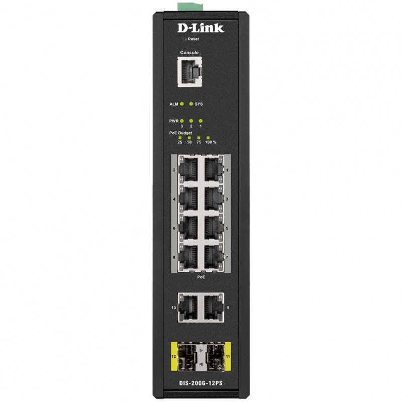 "D-Link 12-Port L2 Industrial Smart Managed Switch with 10 x 1GBaseT(X) (8 PoE 240W) & 2 x SFP. Switch type: Managed, Switch layer: L2. Basic switching RJ-45 Ethernet ports type: Gigabit Ethernet (10/100/1000), Basic switching RJ-45 Ethernet ports quantity: 10, Console port: RJ-45. Full duplex. MAC address table: 8000 entries, Switching capacity: 24 Gbit/s. Networking standards: IEEE 802.1D, IEEE 802.1Q, IEEE 802.1p, IEEE 802.1s, IEEE 802.1w, IEEE 802.1x, IEEE 802.3, IEEE.... DC input voltage: 46 - 54 V. Power over Ethernet (PoE). Wall mountable, Rack mounting"\n"Smart Management