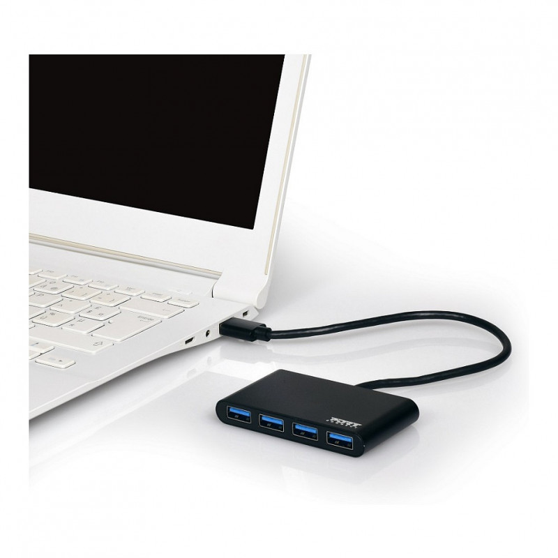 "Port Designs 900121. Host interface: USB 3.2 Gen 1 (3.1 Gen 1) Type-A, Hub interfaces: USB 3.2 Gen 1 (3.1 Gen 1) Type-A. Data transfer rate: 5000 Mbit/s, Product colour: Black, Housing material: Acrylonitrile butadiene styrene (ABS), Aluminium. Power supply type: USB. Width: 77 mm, Depth: 12 mm, Height: 43 mm. Package width: 125 mm, Package depth: 60 mm, Package height: 160 mm"\n"The USB HUB 4 PORTS 3.0 is a USB HUB that can connect your computer to your electronic device (smartphone, tablet, USB key, etc.) or vice versa. Meaning you can transfer your data and charge your device at the same time."