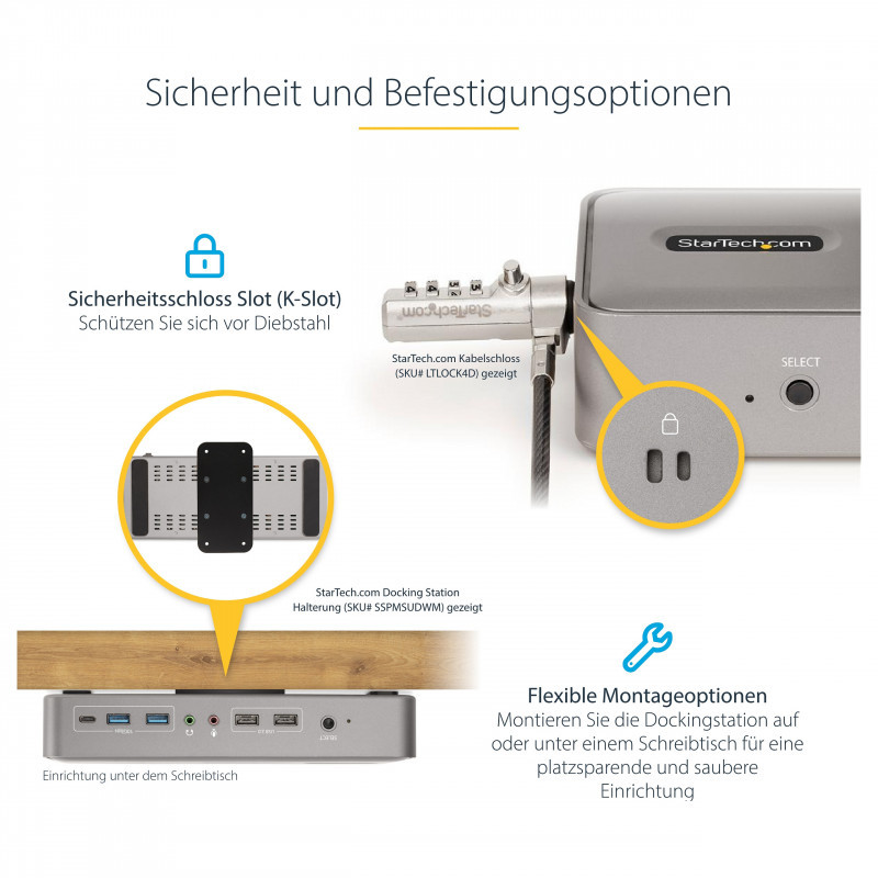 The Dock features a mounting pattern so it can be mounted when paired with StarTech.com mounting accessories (sold separately). Our mounting accessories enable mounting to the VESA pattern on the back of a monitor or to any flat surface. The following mounts are compatible with this product: