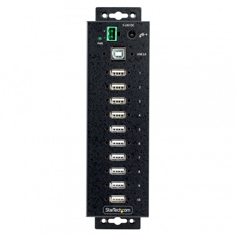 "StarTech.com 10-Port Industrial USB 2.0 Hub, Rugged USB Hub w/ESD Level 4 Protection, DIN/Wall/Desk-Mountable USB-A HUB, USB Port Expander w/Lockable Ports, Multiport USB Hub. Host interface: USB 2.0 Type-B, Hub interfaces: USB 2.0. Data transfer rate: 480 Mbit/s, Product colour: Black. Width: 56 mm, Depth: 198 mm, Height: 31 mm. Package width: 245 mm, Package depth: 168 mm, Package height: 55 mm. Cables included: USB Type-A to USB Type-B"\n"Metal Construction | 6ft (1.8m) USB Host Cable Included