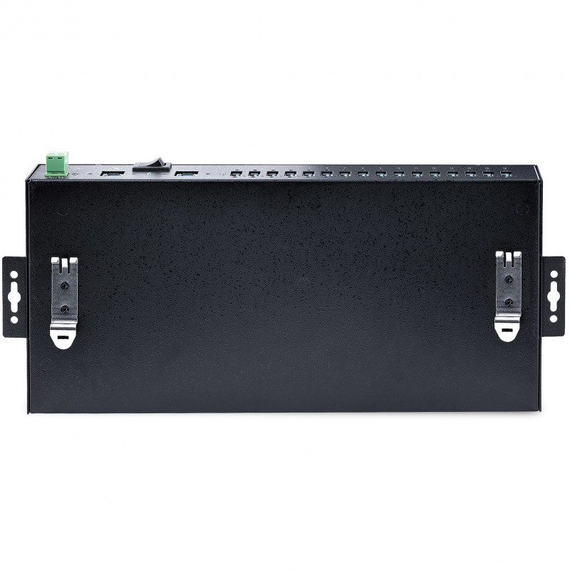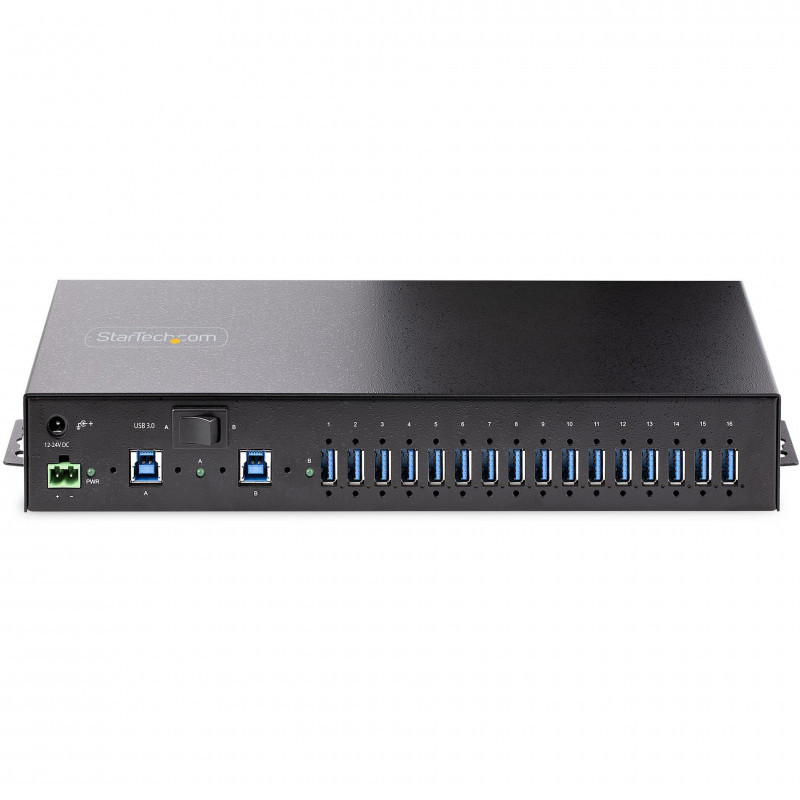 "StarTech.com 16-Port Industrial USB 3.0 Hub 5Gbps, Metal, DIN/Surface/Rack Mountable, ESD Protection, Terminal Block Power, up to 120W Shared USB Charging, Dual-Host Hub/Switch. Host interface: USB 3.2 Gen 1 (3.1 Gen 1) Type-B, Hub interfaces: USB 3.2 Gen 1 (3.1 Gen 1) Type-A. Data transfer rate: 5000 Mbit/s, Product colour: Black, Housing material: Steel. Power supply type: DC, Input voltage: 12 - 24 V, Power plug type: Type M. Width: 31 mm, Depth: 13 mm, Height: 44 mm. Package width: 130 mm, Package depth: 280 mm, Package height: 43 mm"\n"Add 16x USB 3.2 Gen 1 (5 Gbps) ports to two host computers, using this DIN-rail/Surface/Rack-mountable industrial hub