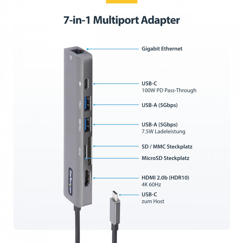 "StarTech.com USB-C Multiport Adapter Hub, USB-C to 4K 60Hz HDMI, Gigabit Ethernet and 100W Laptop Charging for Macbook Pro / Air and Windows. Connectivity technology: Wired, Host interface: USB 3.2 Gen 1 (3.1 Gen 1) Type-C, USB Power Delivery up to: 100 W. Ethernet LAN data rates: 10,100,1000 Mbit/s. Product colour: Black, Grey, Compatible memory cards: MMC, MicroSD (TransFlash), SD, Data transfer rate: 5 Gbit/s. Power consumption (max): 12 W. Windows operating systems supported: Windows 10, Windows 10 Education, Windows 10 Education x64, Windows 10 Enterprise, Windows 10..., Mac operating systems supported: Mac OS X 10.13 High Sierra, Mac OS X 10.14 Mojave, Mac OS X 10.15 Catalina, Mac OS X 10.15.3..., Mobile operating systems supported: Android, iPadOS"\n"4K 60Hz HDMI, 2x USB 5Gbps, GbE, SD/microSD, and 100W Power Delivery Pass-Through, all from one USB-C connection