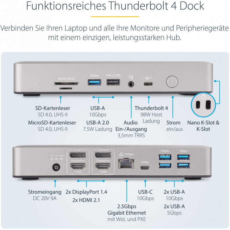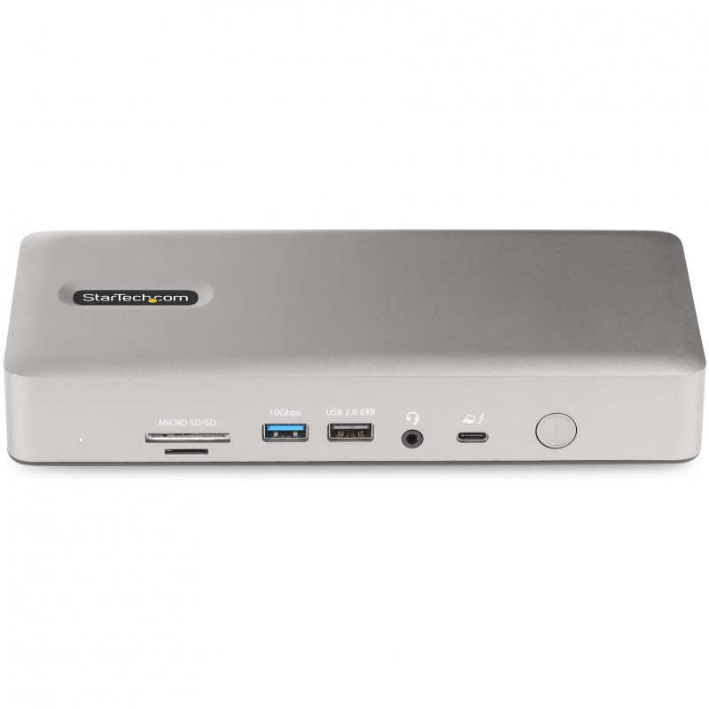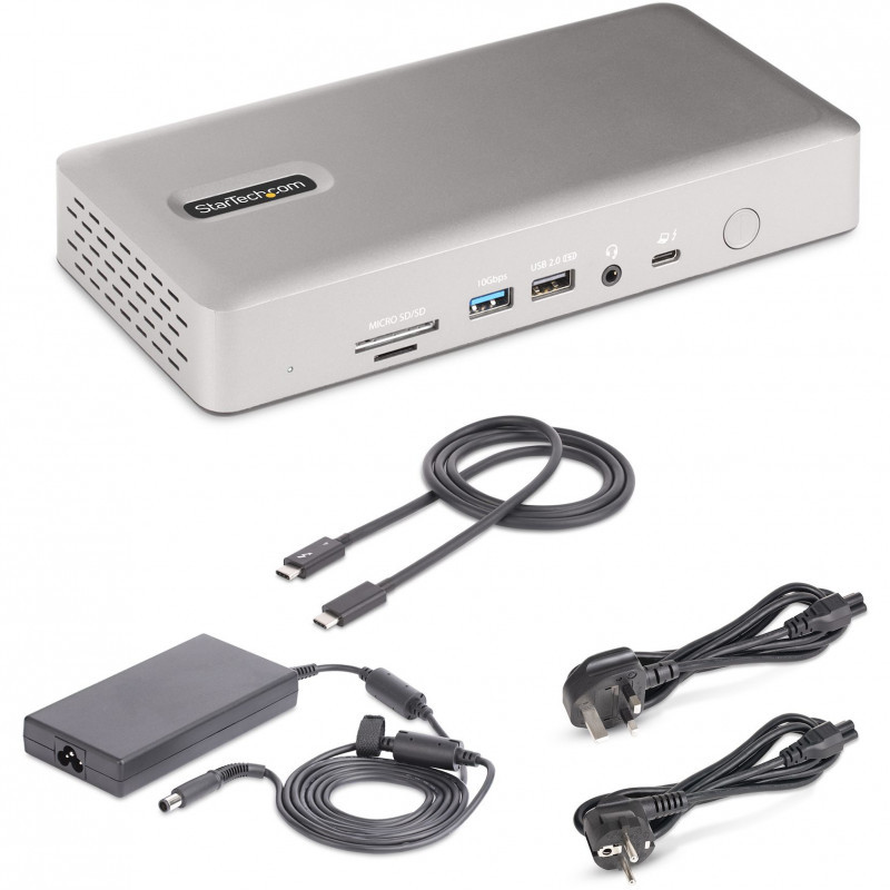 "StarTech.com Universal USB4 & Thunderbolt 4 Docking Station, Quad Display on Windows, Dual Display on MacBook, HDMI DP Dock with 98W Laptop Charging. Connectivity technology: Wired, Host interface: Thunderbolt 4, USB Power Delivery up to: 98 W. Ethernet LAN data rates: 10,100,1000,2500 Mbit/s, Copper ethernet cabling technology: 2.5GBASE-T, 10BASE-T, 100BASE-T, 1000BASE-T. Product colour: Grey, Compatible memory cards: MicroSD (TransFlash), MicroSDHC, MicroSDXC, SD, SDHC, SDXC, Data transfer rate: 40 Gbit/s. Power source type: DC, AC input voltage: 110 - 240 V, Input current: 2.5 A. Windows operating systems supported: Windows 10, Windows 10 Education, Windows 10 Education x64, Windows 10 Enterprise, Windows 10..., Mac operating systems supported: Mac OS X 11.0 Big Sur, Mac OS X 12.0 Monterey, Mac OS X 13.0 Ventura"\n"Universal Laptop Dock offering driverless compatibility with Windows and macOS