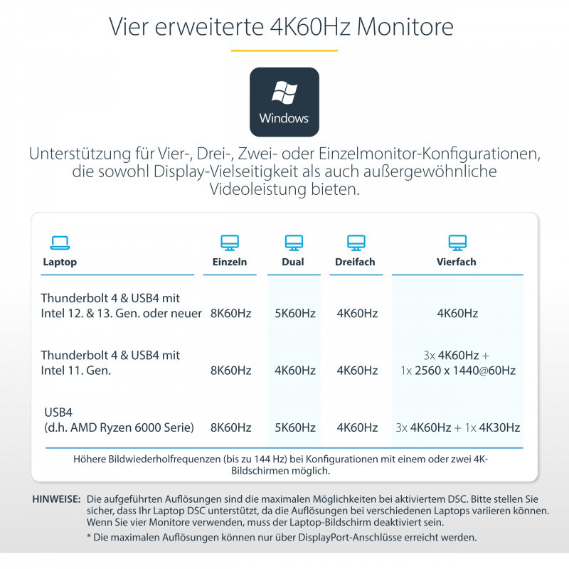 Push the boundaries of productivity with quad 4K 60Hz displays on Windows laptops running the latest Intel 12th Gen CPUs (or later) and DP 1.4 with DSC. Legacy systems still benefit from flexible dual or triple monitor setups.