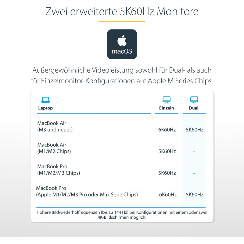Experience dual extended 4K displays on MacBook Air and Pro powered by M3 or M4 chips (clamshell mode required for M3), and MacBook M1 / M2 Pro or Max configurations. For Apple computers featuring the M-series base processor only a single display is supported.