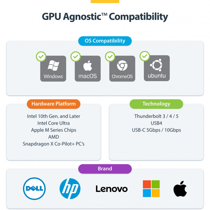 This triple-4K docking station uses a combination of its integrated DisplayLink® graphics controller and your computer's DP Alt Mode enabled USB-C port to provide three independent 4K displays.