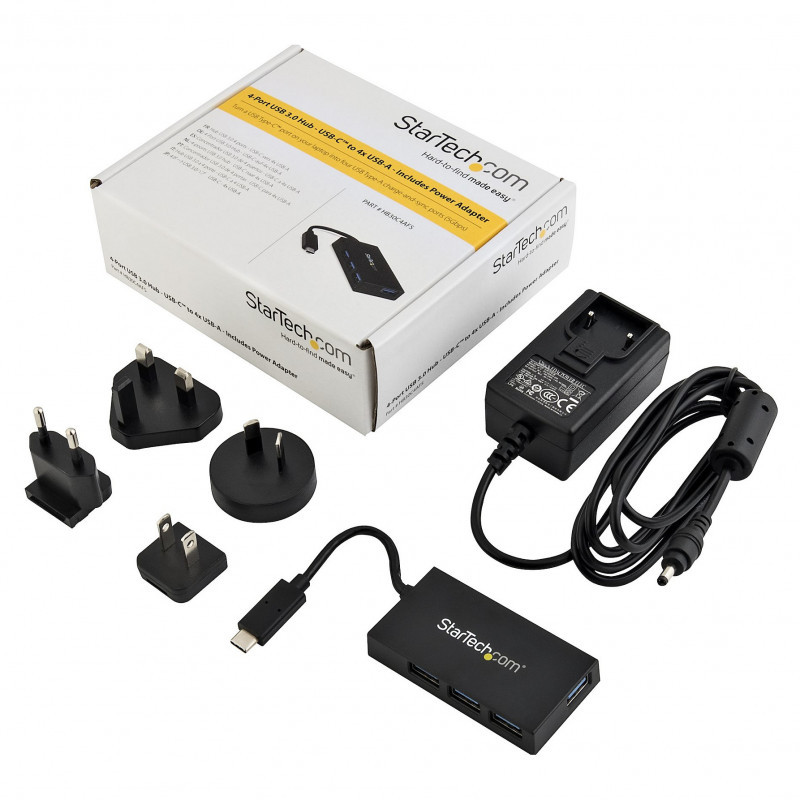 "StarTech.com 4 Port USB C Hub - USB Type-C Hub w/ 4x USB-A Ports (USB 3.0/3.1 Gen 1 SuperSpeed 5Gbps) - USB Bus or Self Power - Portable USB-C to USB-A BC 1.2 Charging Hub w/ Power Adapter~4 Port USB C Hub - USB Type-C Hub w/ 4x USB-A Ports USB 3.0 hub (5Gbps) - USB Bus or Self Power - Portable USB-C to USB-A BC 1.2 Charging Hub w/ Power Adapter. Host interface: USB 3.2 Gen 1 (3.1 Gen 1) Type-C, Hub interfaces: USB 3.2 Gen 1 (3.1 Gen 1) Type-A. Data transfer rate: 5000 Mbit/s, Product colour: Black, Housing material: Plastic. Power consumption (typical): 20 W, Input voltage: 100 - 240 V, Input current: 1 A. Width: 74 mm, Depth: 39 mm, Height: 13 mm. Package width: 165 mm, Package depth: 49 mm, Package height: 131 mm"\n"Turn your laptop’s USB Type-C port into four USB Type-A charge-and-sync ports (5Gbps)