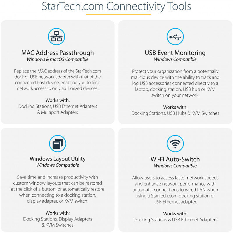 Developed to improve performance and security, StarTech.com Connectivity Tools is the only software suite on the market that works with a wide range of IT connectivity accessories. The software suite includes: