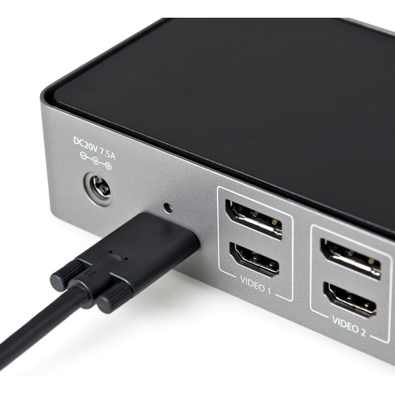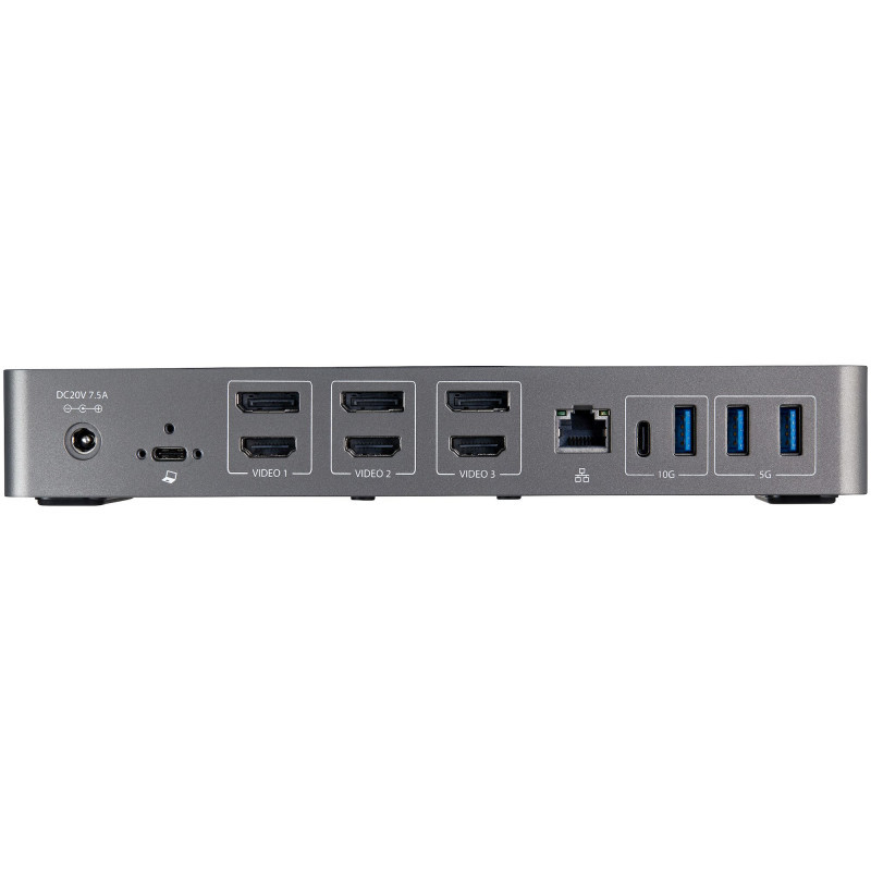 "StarTech.com USB-C & USB-A Dock - Hybrid Universal Triple Monitor Laptop Docking Station DisplayPort & HDMI 4K 60Hz - 85W Power Delivery, 6x USB Hub, GbE, Audio - USB 3.1 Gen 2 10Gbps - TAA. Connectivity technology: Wired, Host interface: USB 3.2 Gen 2 (3.1 Gen 2) Type-C, USB Power Delivery up to: 85 W. Ethernet LAN data rates: 10,100,1000 Mbit/s. Product colour: Black, Grey, Data transfer rate: 10 Gbit/s, Maximum digital resolution: 3840 x 2160 pixels. AC input voltage: 100 - 240 V, Input current: 2.5 A, Output voltage: 20 V. Windows operating systems supported: Windows 10, Windows 10 Education, Windows 10 Education x64, Windows 10 Enterprise, Windows 10..., Mac operating systems supported: Mac OS X 10.10 Yosemite, Mac OS X 10.11 El Capitan, Mac OS X 10.12 Sierra, Mac OS X 10.13 High..."\n"USB-C & USB-A Dock | USB 3.2 Gen 2 10Gbps | 4K 60HZ HDMI | DisplayPort | 85W Power Delivery