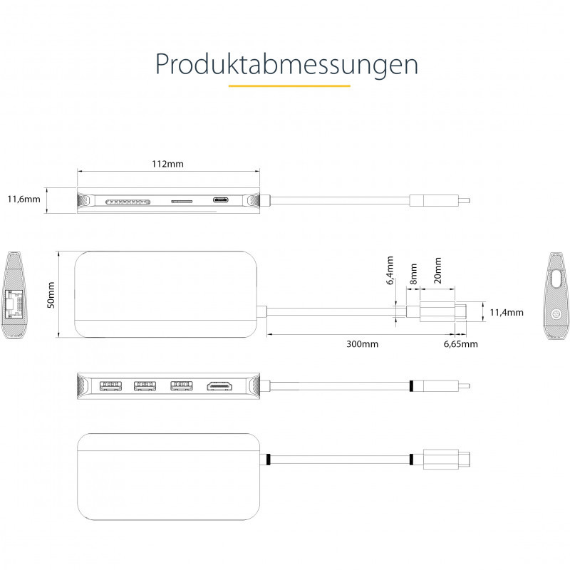 This USB-C™ Multiport Adapter with DP 1.4 Alt Mode supports 4K 60Hz HDMI® (HDR) and turns your MacBook, Dell XPS, or other USB-C laptop or tablet into a workstation, anywhere you go. The USB Type-C™ Multiport Adapter features a 4K HDMI video output, three USB 3.2 Gen 1 Type-A (5Gbps) ports, SD and MicroSD card readers and a Gigabit Ethernet port, all through one connection to your laptop's USB-C, USB4, or Thunderbolt 3/4™ port. Plus, it offers advanced charging and flexibility through a shared USB-C Power Delivery 3.0 and Data port which can be used to connect peripherals, with USB 2.0 transfer speeds (480Mbps), when a power source is not connected. The Multiport Adapter features an extra-long attached 12-inch (30 cm) host cable - for an extended reach, to offer more set up flexibility.